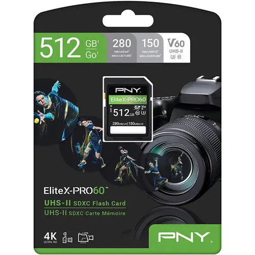 The PNY 512GB EliteX-PRO60 UHS-II SDXC Memory Card is built for professional photographers and videographers, offering high-speed performance and reliable storage for 4K & Full HD video, RAW images, and burst photography.