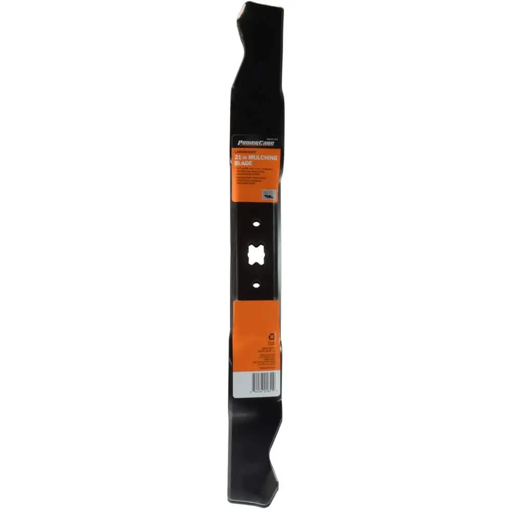 The PowerCare replacement mulching blade is designed to fit various 21 in. mowers, including brands like MTD, Cub Cadet, Troy-Bilt, Craftsman, Yard Man, and others that require a bow-tie center hole. It is built to meet or exceed OEM specifications. Always verify the correct replacement blade number in your owner's manual to ensure a proper fit.