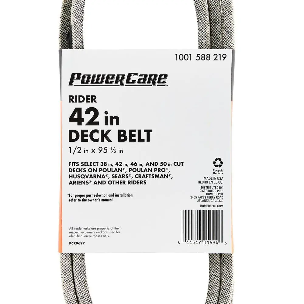 The PowerCare Deck Belt is designed for 42 in. cut mowers from Craftsman, Husqvarna, and Poulan. Replacing OEM numbers 144959 and 532144959, this belt measures 95-1/2 in. long and 1/2 in. wide, featuring aramid cord construction for added durability. It fits a variety of mowers with 38 in., 42 in., 46 in., and 50 in. cut decks from Poulan, Poulan Pro, Husqvarna, Craftsman, Ariens, and other riders. Manufactured to meet or exceed OEM specifications for reliable performance.