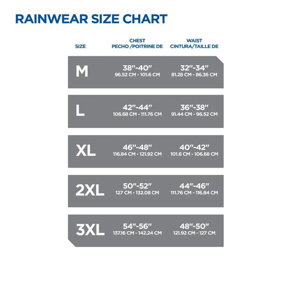This 3-piece rain suit is made from durable 170T polyester with waterproof seams, designed for medium to heavy applications. It features a vented cape back for breathability and adjustable snap closures at the wrists and ankles to ensure a secure fit and allow a wide range of motion. The jacket has an easy zip-up front with a button storm flap for added protection, while the bibs have an elastic back for a better fit and to keep water out. Reflective tape enhances visibility in low light conditions, and the drawstring sweep on the jacket helps keep moisture at bay.