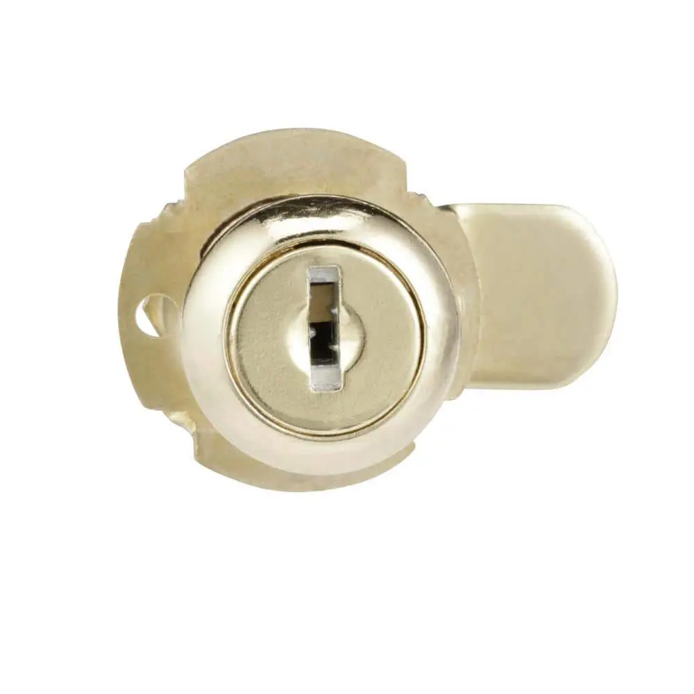 This drawer and cabinet lock offers a simple and effective way to secure drawers, files, and small items. Made from durable diecast and steel components with a brass finish, it features a 3/4 inch outside cylinder diameter and a 1-1/8 inch length, suitable for panels up to 13/16 inches thick. With easy installation and compatibility with both metal and wood panels, this lock includes everything needed for installation: 3 cams, a trim collar, 2 reversible rotation washers, 2 keys, and fasteners. The lock is keyed differently with a Yale Y-11 keyway.