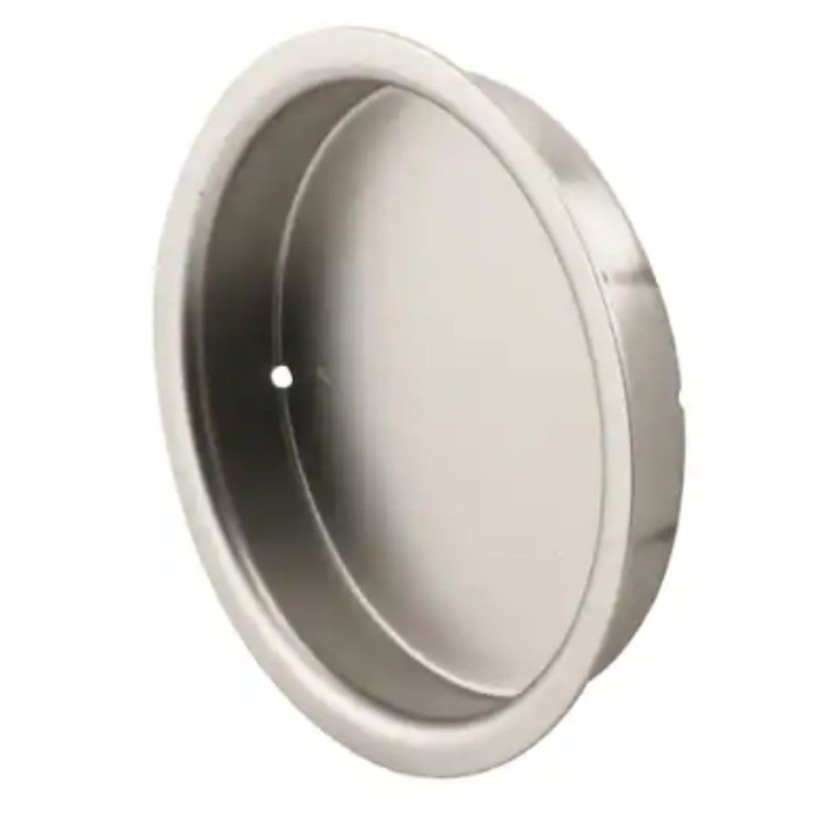 This round door pull is made of durable solid brass and features a satin nickel finish. It is designed to fit perfectly into a 2-1/8 inch diameter hole in a closet door and can be secured in place using a set of nails. In case the hole is slightly worn and larger, the use of silicone glue may be necessary.