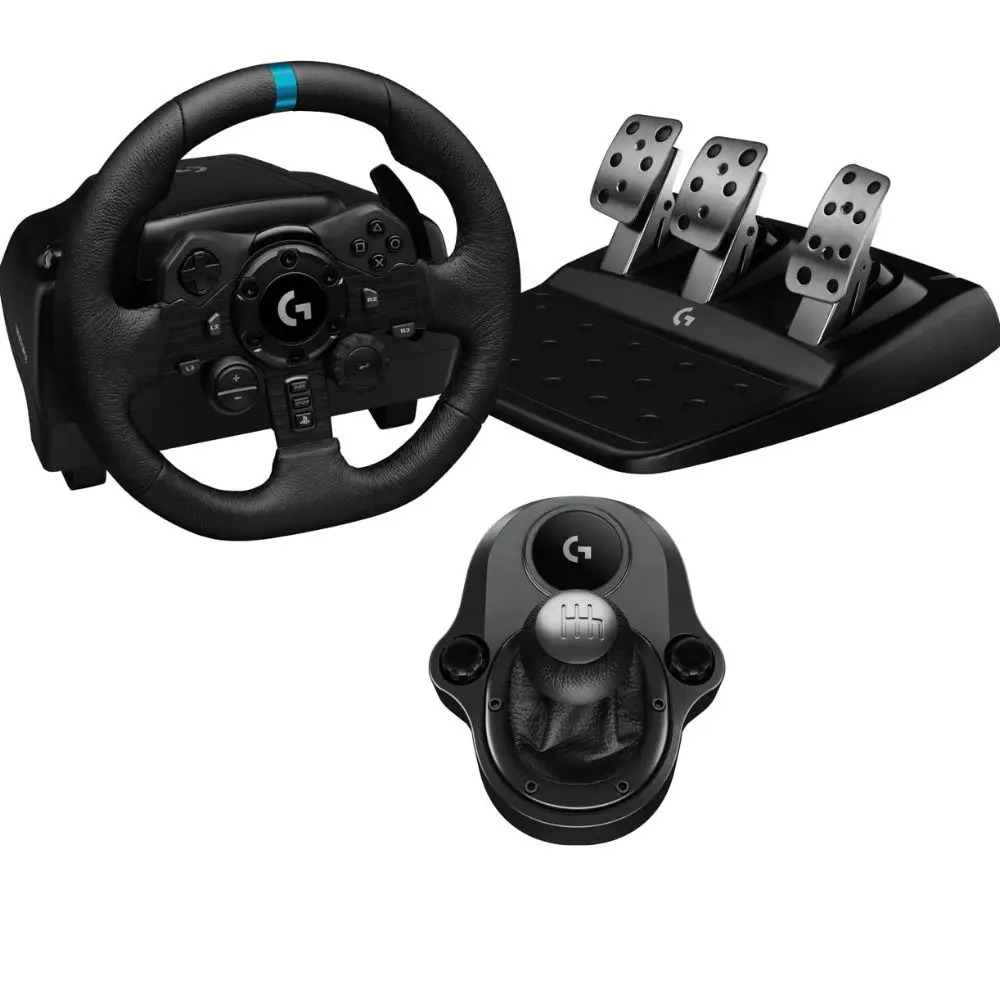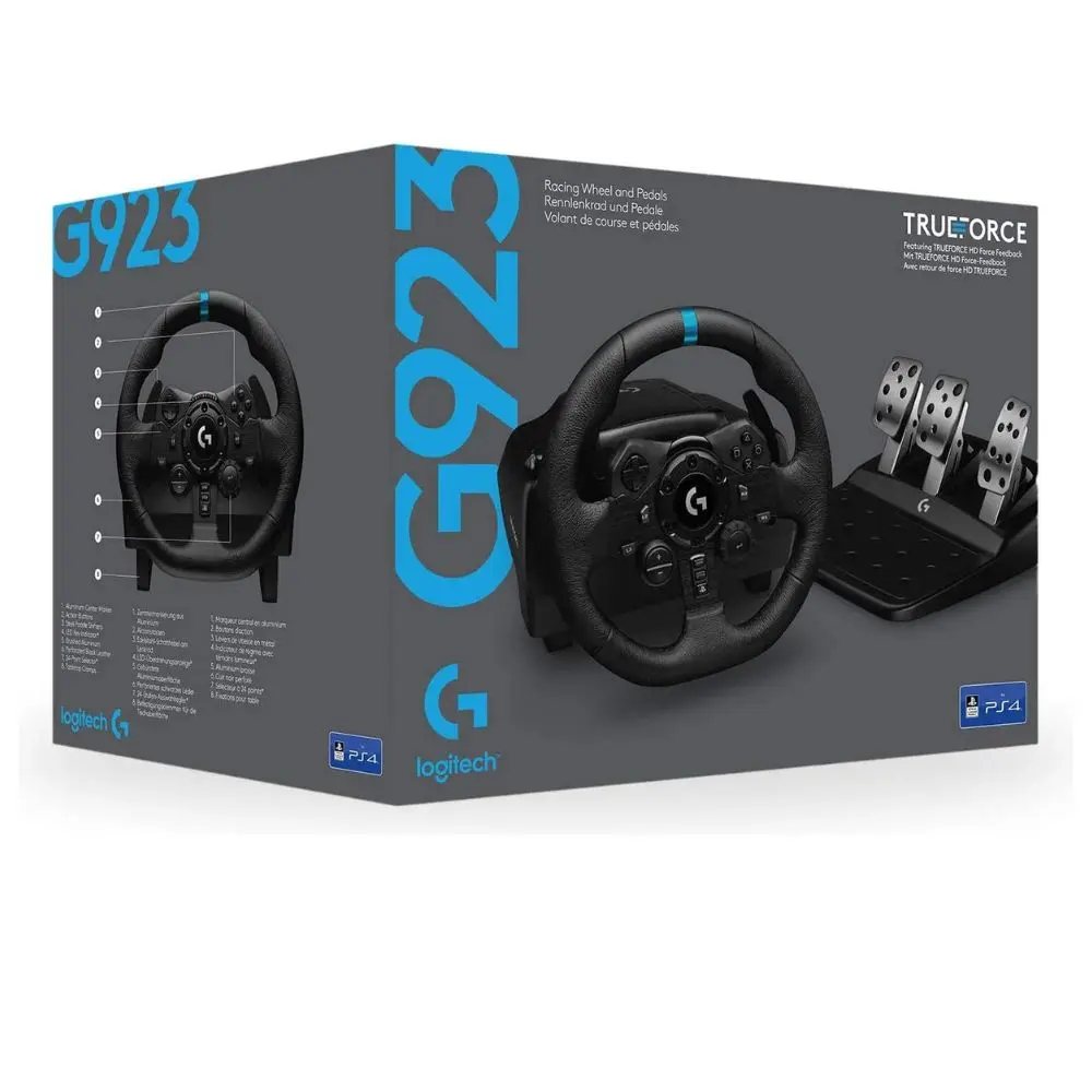 Product Overview: The Logitech G923 TrueForce Racing Wheel and Pedals for PS5, PS4, and PC are designed to deliver a realistic racing experience with high-definition force feedback and precision controls. Built with TRUEFORCE technology, it provides real-time feedback to simulate the feel of the road, while the premium leather-wrapped wheel and metal pedals offer durability and comfort.