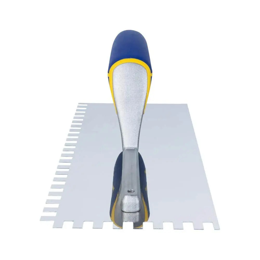 The QEP 1/4 in. x 3/8 in. x 1/4 in. Comfort Grip Stainless Steel Square-Notch Flooring Trowel is designed for easy and efficient application of thinset, mortar, and adhesives. Made from durable stainless steel, it ensures long-lasting performance and precision in flooring installations. The ergonomic comfort grip handle reduces hand fatigue, providing better control and comfort during extended use. Perfect for tile and stone installations, this trowel delivers professional results with every project