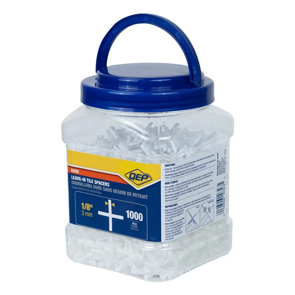 The QEP 1/8 in. Leave-in Hard Style Tile Spacers come in a convenient jar of 1000, making them perfect for large tile projects. Their 1/8 in. size provides precise spacing between tiles, ensuring even and consistent grout lines. Designed with a leave-in feature, there’s no need to remove them after installation, saving time and effort. Made from durable material, these spacers provide reliable support during tile setting, and their easy-to-use design makes tile placement a breeze