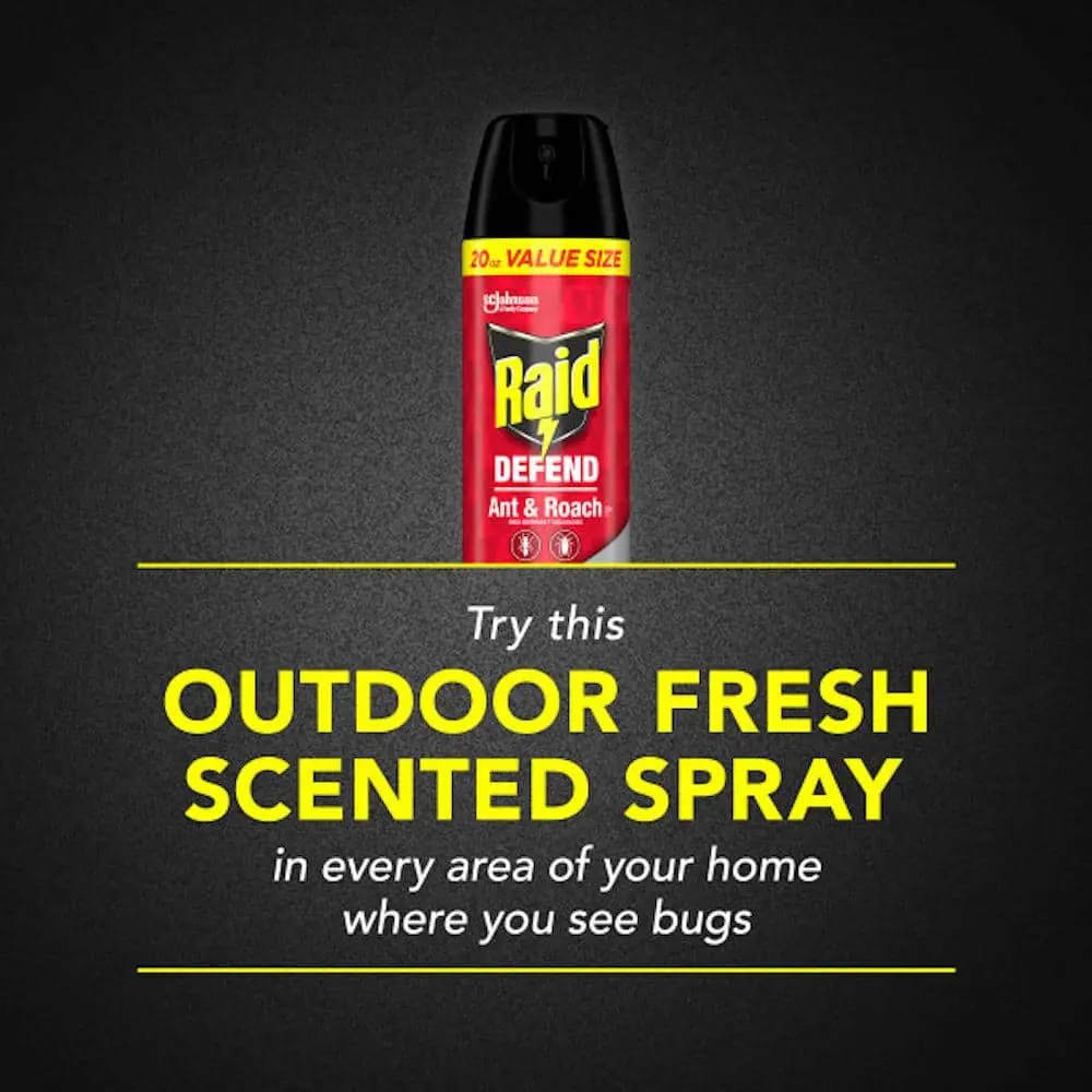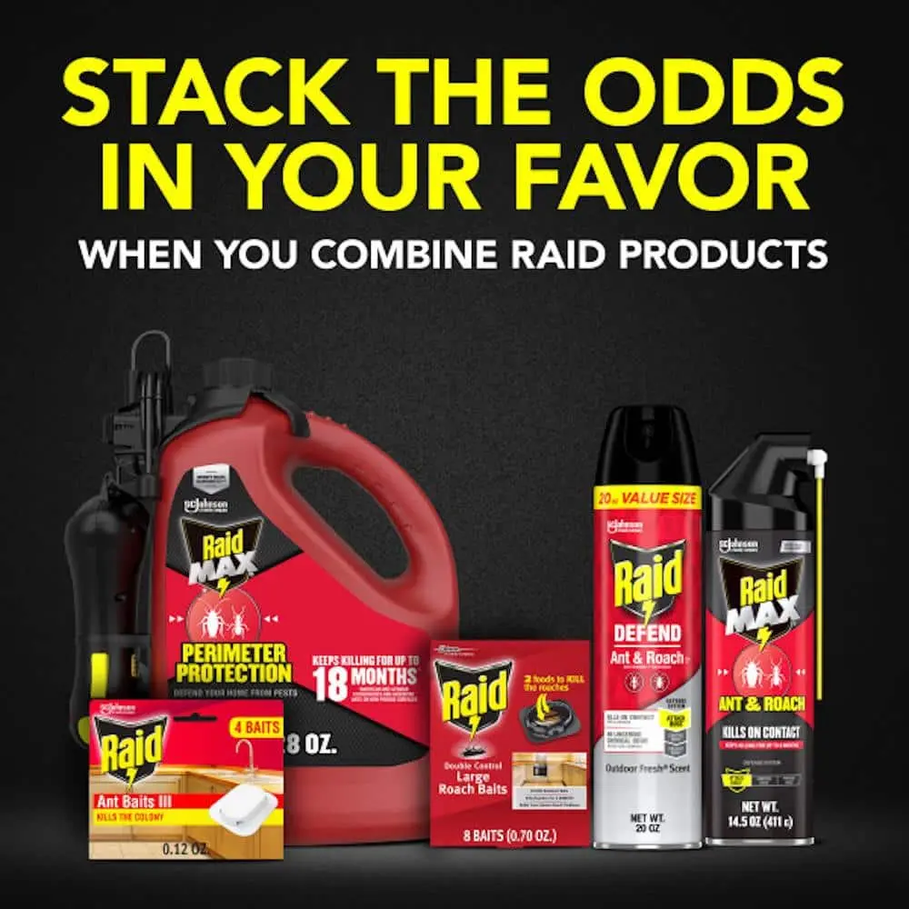 Raid Ant & Roach Killer works on contact and continues to kill with residual action for up to 4 weeks*. This easy-to-use spray helps protect your family by eliminating ants, cockroaches, and other insects. It targets a wide range of pests, including cockroaches, ants, silverfish, crickets, earwigs, household spiders, multicolored Asian lady beetles, and stinkbugs, and can be applied directly to surfaces where these bugs are found.