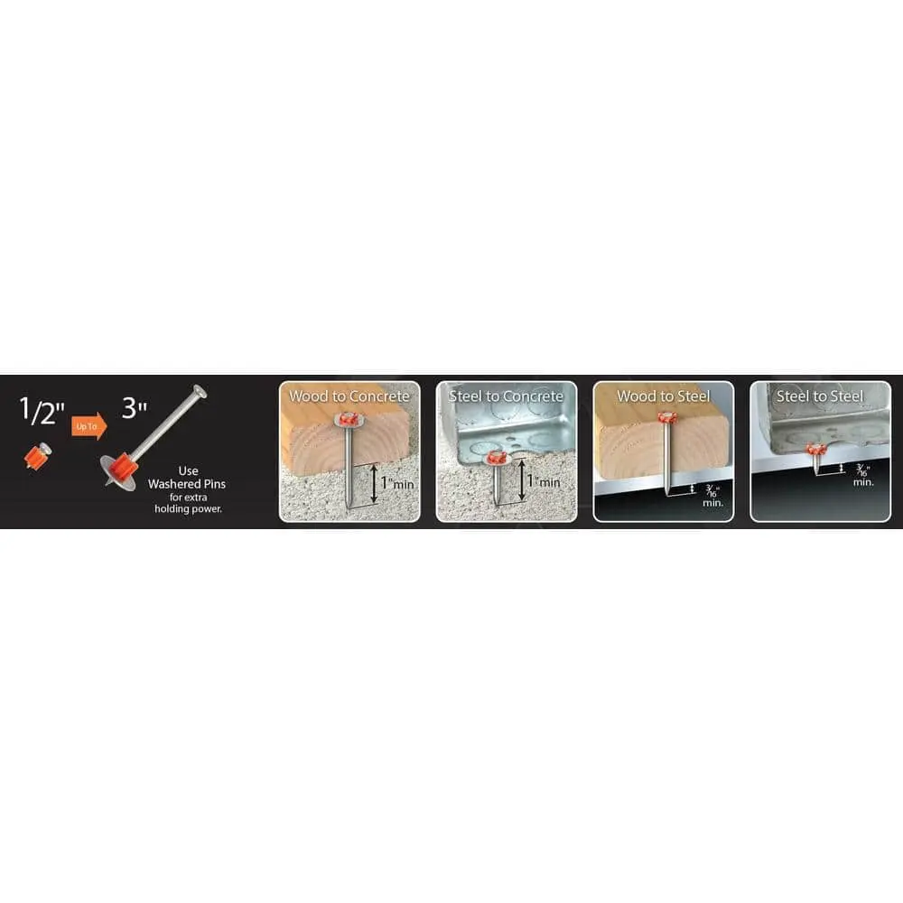 The Ramset 1 in. Drive Pins (100-Pack) are designed for durability and high-volume use. With a 1 in. length, these pins are ideal for securing materials effectively. The 100-pack ensures you have plenty of pins for multiple projects. Crafted from steel construction, they are built for strength and reliability in fastening tasks. These pins are compatible with Ramset tools, making them versatile for use with concrete, steel, and more. Their precision design guarantees accurate and secure fastening every time