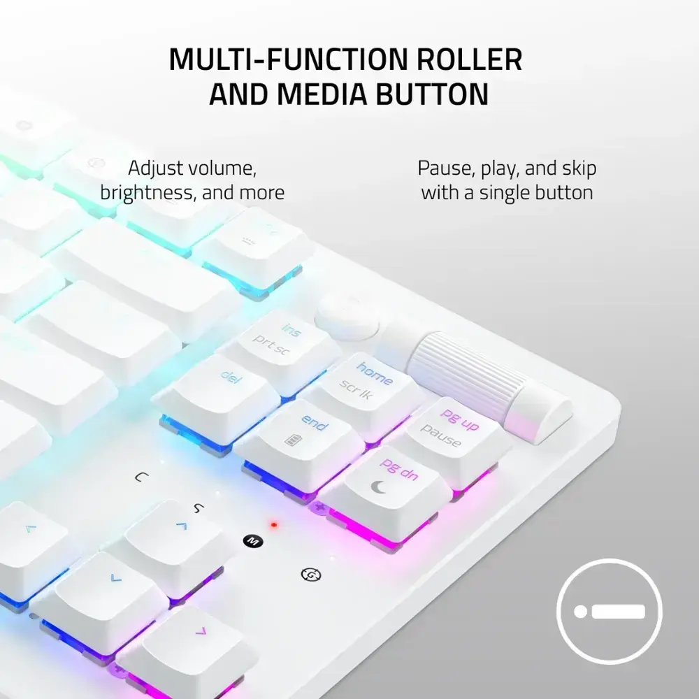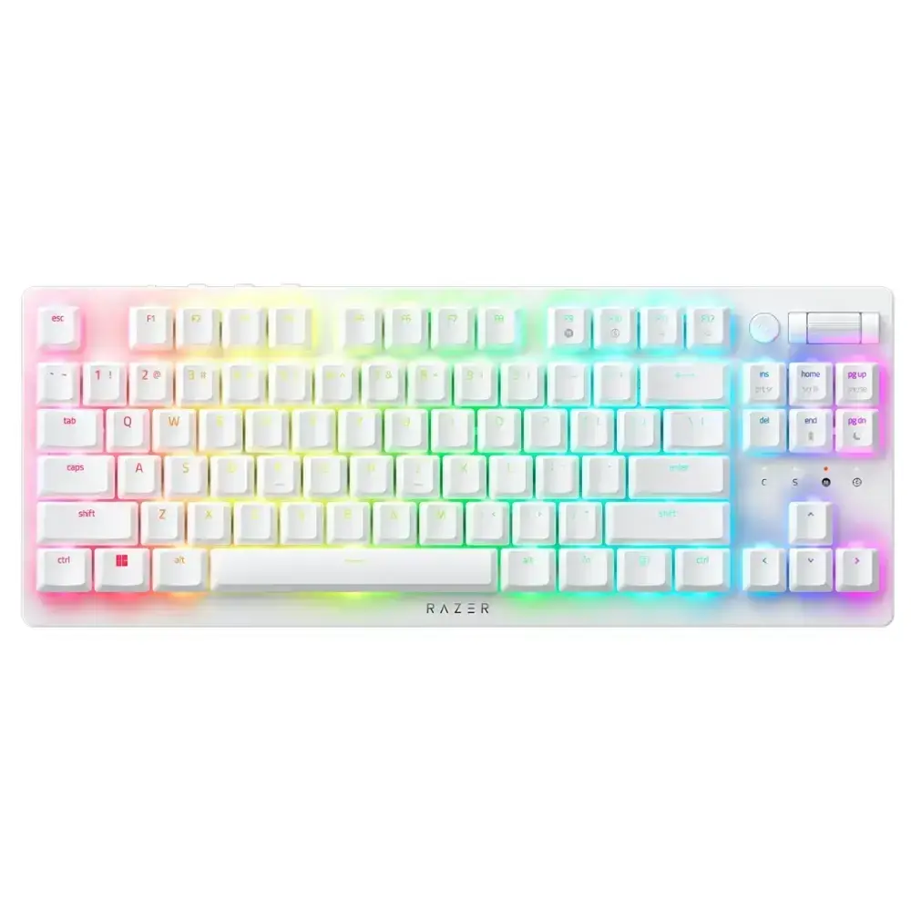 The Razer DeathStalker V2 Pro TKL Wireless Optical Linear Switch Gaming Keyboard offers wireless connectivity, ensuring a reliable, lag-free gaming experience. Featuring optical linear switches, it delivers fast and responsive keystrokes for smoother gameplay. The low-profile design provides a sleek and ergonomic typing experience, while the tenkeyless (TKL) layout offers a compact form for more desk space and portability. With customizable RGB Chroma lighting, you can personalize your setup, all in a stylish white finish that adds a clean, premium look to your gaming space. Additionally, its long battery life ensures you can game for extended periods with minimal charging