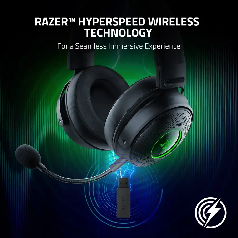 The Razer Kraken V3 Pro HyperSense Wireless Gaming Headset for PC combines wireless connectivity with Razer HyperSpeed technology for lag-free, high-quality sound. Experience an immersive gaming environment with HyperSense technology, providing haptic feedback for tactile audio sensations. The THX Spatial Audio delivers 3D surround sound, enhancing every in-game moment. Personalize your headset with Razer Chroma RGB lighting for a dynamic visual touch. Designed for comfort, the headset features memory foam ear cushions and a soft headband, ensuring a perfect fit for long gaming sessions. With up to 72 hours of battery life, you can game for extended hours without interruptions, while the Razer HyperClear Cardioid Mic ensures clear and crisp voice communication