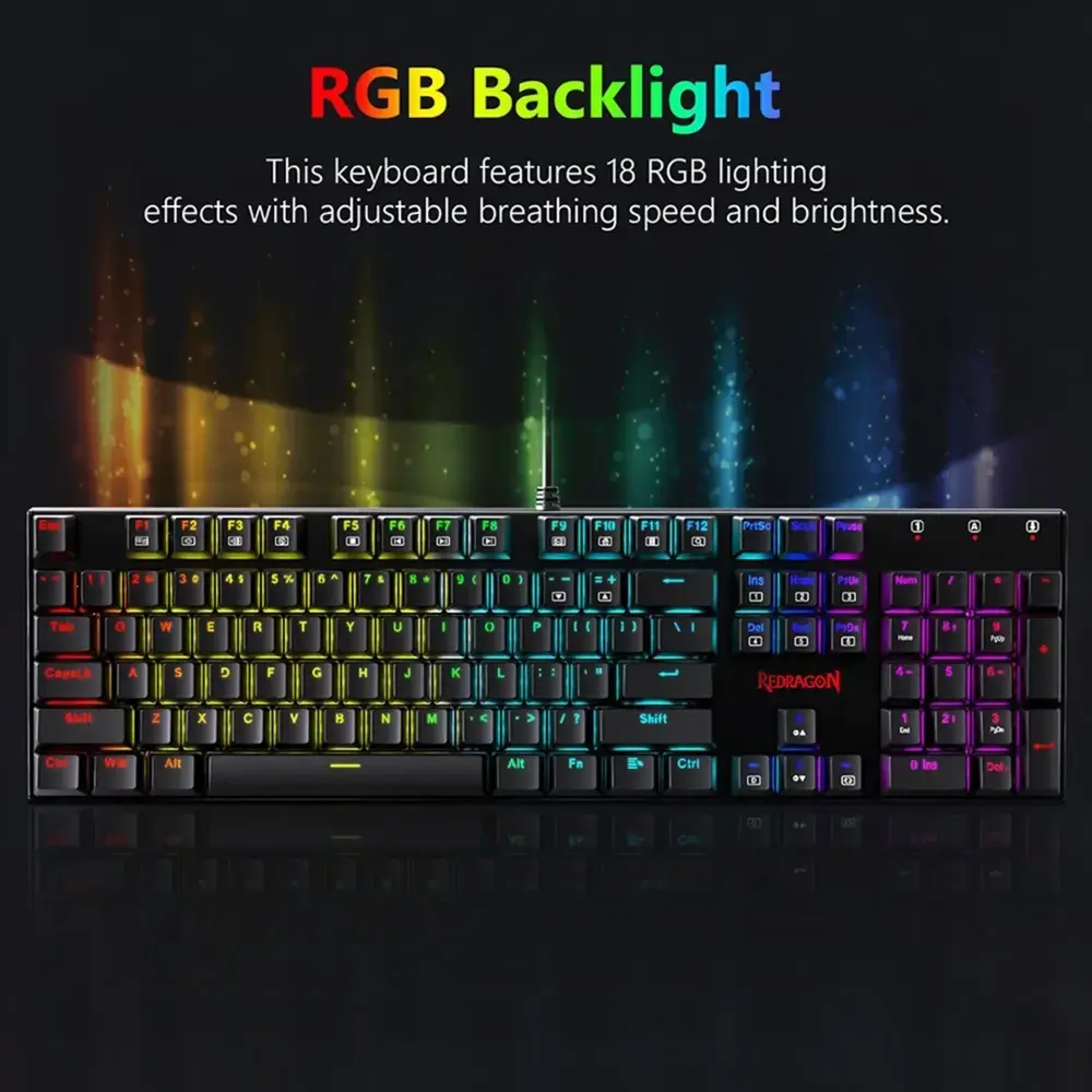 The Redragon K565 Mechanical Gaming Keyboard features responsive Red switches, RGB backlighting with over 16.8 million color options, and 20 customizable effects. Its fully programmable keys and macros enhance gaming and productivity. Built with a durable aluminum frame, it’s designed for long-lasting use and stability. The keyboard includes anti-ghosting technology for simultaneous key presses and is compatible with both Windows and Mac systems. Ideal for gamers and professionals, it delivers performance, customization, and reliability.