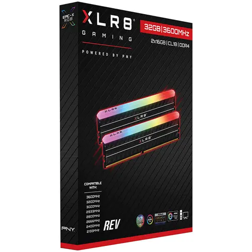 Key Features 32GB (2 x 16GB) Capacity 3600 MHz Clock Speed PC4-28800 288-Pin DIMM 1.35V CL18 Latency XMP 2.0 RGB Lighting Embrace customizable style as well as high-speed performance with the PNY 32GB XLR8 Gaming REV RGB DDR4 Memory Kit. Equipped with a black heatsink and customizable RGB lighting, these memory modules enhance multitasking capabilities while enabling you to add a sense of personality to your system. You get two 16GB 3600 MHz modules for a total 32GB capacity, giving you enough memory to run resource-demanding games and enhance rendering speeds for photo and video projects. With XMP 2.0 overclocking technology and a CL18 latency rating, you can reach optimal speeds that operate cohesively with your motherboard and processor for greater multitasking capabilities. Integrated heat spreaders control thermal performance and features customizable RGB lighting that works with most major motherboard manufacturers, giving you an array of custom colors and lighting effects. The XLR8 Gaming REV RGB includes a limited lifetime warranty, so you can game and create with peace of mind.