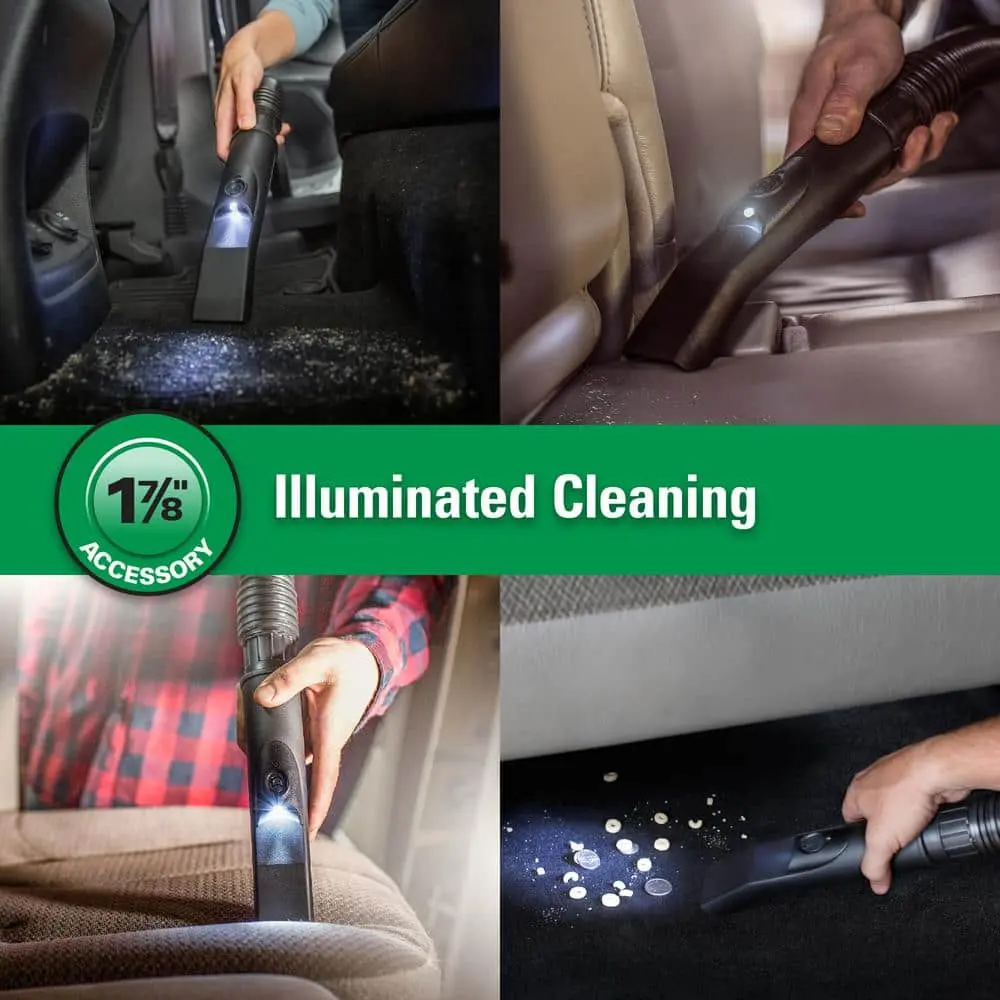 The RIDGID 1-7/8 in. LED Lighted Car Nozzle is a versatile and durable wet/dry vac accessory designed for efficient cleaning. Its built-in LED light enhances visibility, making it easier to clean vehicle upholstery, carpets, and hard-to-reach areas like under and between seats. The LED can be activated with a simple switch for continuous illumination or pressed for intermittent use.