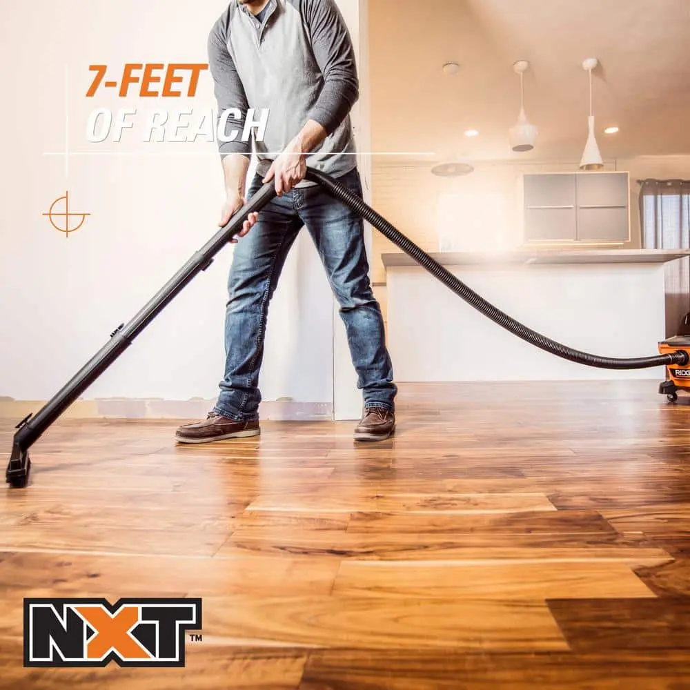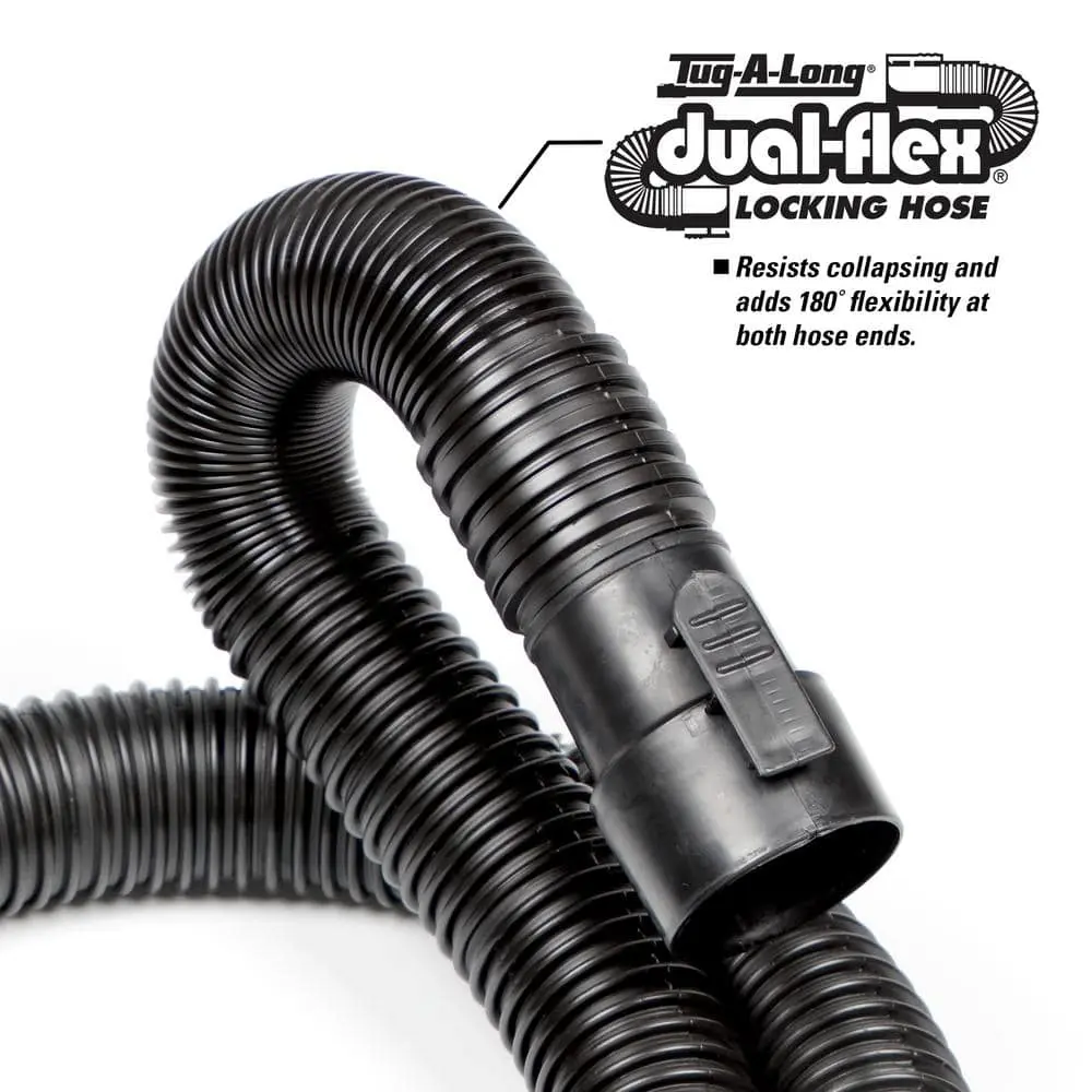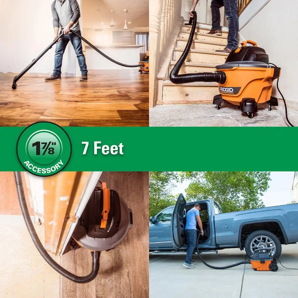 The RIDGID Tug-A-Long Replacement Wet/Dry Vac Hose offers a 1-7/8 in. diameter and extends 7 ft. for added reach and flexibility. This kit includes an adapter that connects 1-7/8 in. hoses to 1-1/4 in. accessories, enhancing versatility. The locking tab on the hose cuff ensures a secure connection to the vacuum, preventing accidental disconnections during use. Designed as a replacement hose for RIDGID 4 Gal., 6 Gal., and 9 Gal. wet/dry vacuums, it comes with all necessary adapters to fit any RIDGID vacuum.