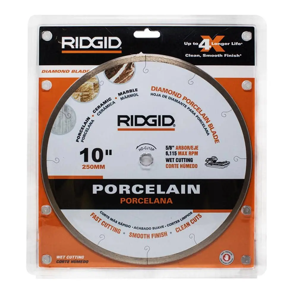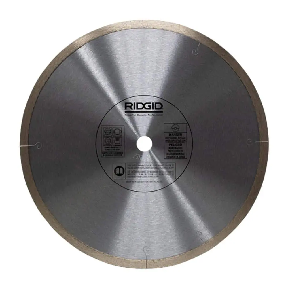 The RIDGID 10 in. Premium Tile Diamond Blade is designed for durability and long-lasting performance, featuring a premium diamond construction. It is compatible with both wet and dry saws, making it versatile for various cutting needs. This blade ensures smooth and accurate tile cuts, making it ideal for ceramic, porcelain, marble, and stone tiles, delivering high-quality results with extended blade life