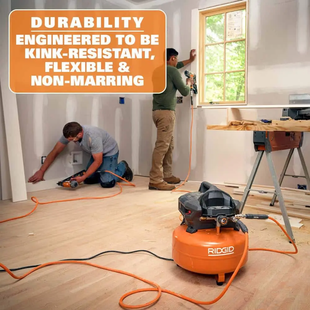 The RIDGID 1/4 in. 50 ft. Lay Flat Air Hose is designed for convenience and durability. Its lay flat design prevents kinking and tangling, making it easy to store and manage. Built with durable construction, this hose ensures long-lasting use even in demanding environments. It remains flexible in cold weather, offering reliable performance year-round. The lightweight design makes it easy to handle and transport, while its versatility allows it to be used with a wide range of air tools and applications.