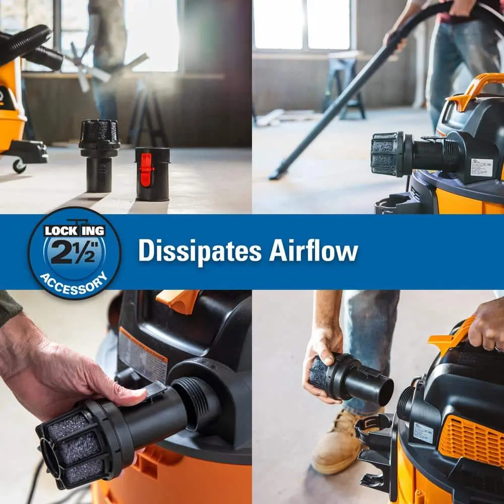 The VT2525 RIDGID Diffuser Accessory is designed to diffuse the airstream from your wet/dry vacuum, preventing debris and dust from being expelled through the blower port. This attachment is compatible with all RIDGID wet/dry vacuums that have a blower port, and it maintains the vacuum’s suction performance without any reduction in power.
