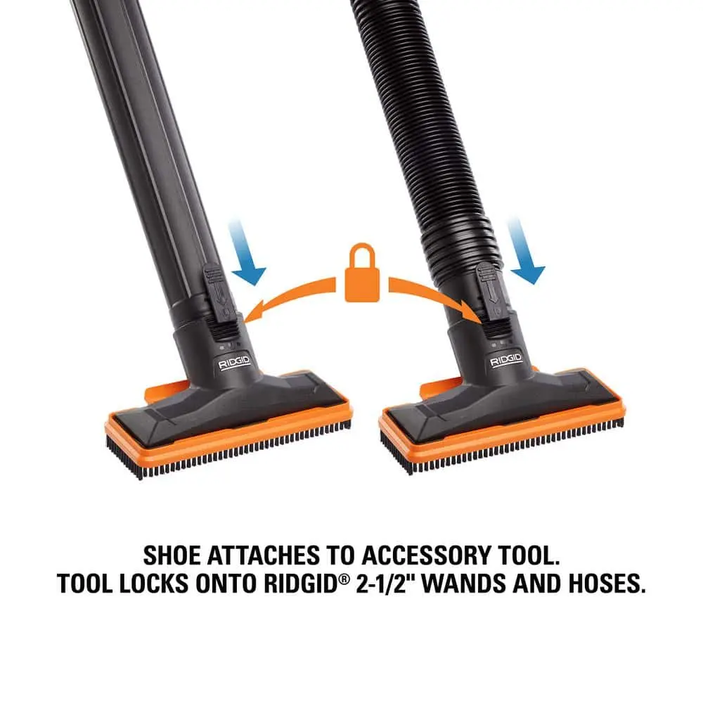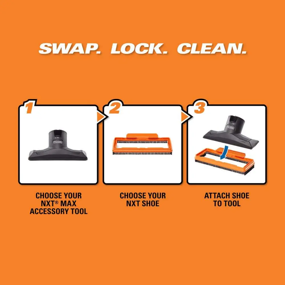 Simply attach a shoe at a 45-degree angle and snap it into place for a secure fit. For removal, step on the back tab to release it. Designed for heavy-duty cleaning, RIDGID NXT Max Accessories enhance productivity, handle larger debris, and support various cleanup needs, from construction sites to emergency messes.