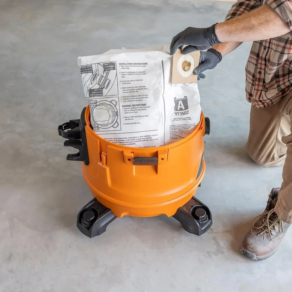 These high-efficiency bags reduce filter clogs, improving vacuum performance and extending filter life. For optimal results, pair with a RIDGID vacuum filter (sold separately). Available in 6, 12, 24, and 36-count packs to meet various project needs. Installation and removal are easy: align the collar with the inlet, press it against the drum, and pop the collar out for disposal.