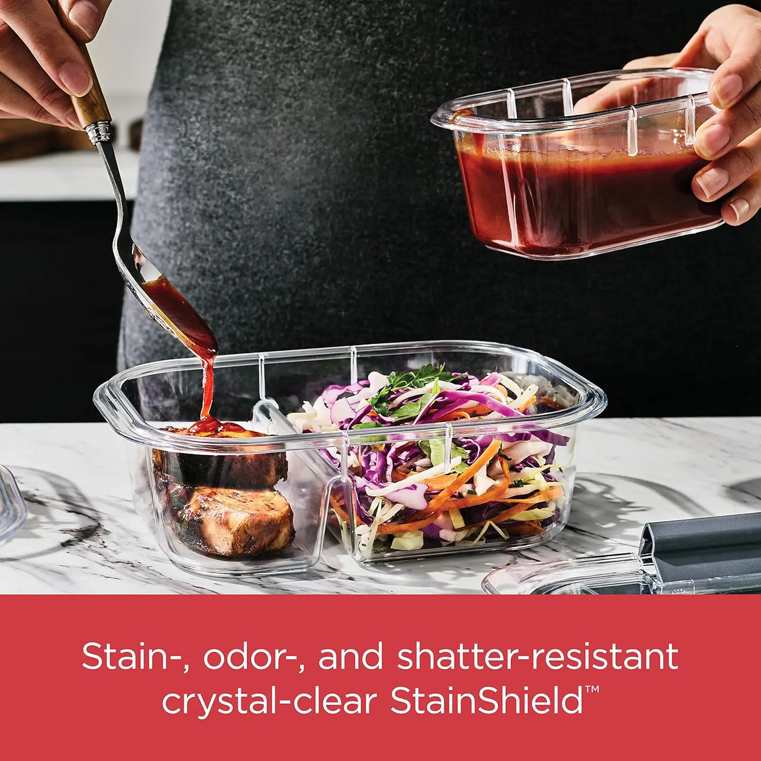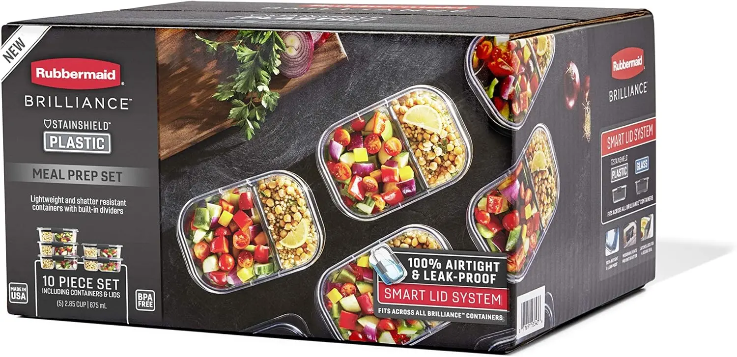 StainShield Plastic: Premium material with crystal-clear lids and bases, stain- and odor-resistant. 100% Leakproof & Airtight: Guaranteed leakproof with secure latches. Two Compartments: Ideal for prepping a full entree and side dish. Easy Microwaving: Built-in vents for splatter-resistant microwaving with the lid on. Smart Lid System: Lids fit across same-size Brilliance containers. Durable & Lightweight: Shatter-resistant and easy to carry. 360-Degree Clarity: Easily see contents from any angle. 2.85-Cup Capacity: Convenient two-compartment design.