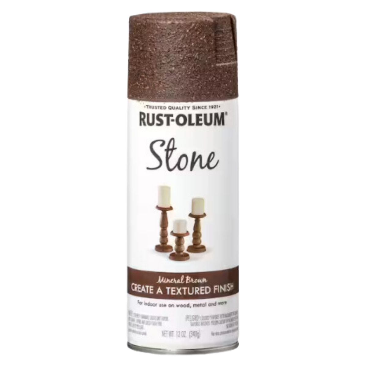 The Rust-Oleum Specialty 12 oz. Stone Mineral Brown Textured Spray Paint offers a natural stone appearance, perfect for revitalizing decorative items with the warm, sun-baked look of fired clay. It adheres effectively to various materials such as wood, metal, masonry, glass, ceramics, plaster, and clay, covering an area of up to 12 sq. ft. per can. To achieve the best results, it's recommended to apply a base coat that harmonizes with the stone finish. This product is intended for indoor use only, featuring a straightforward one-step spray application that dries to the touch in just 15 minutes. Cleanup is easy: use soap and water for wet paint and mineral spirits for dried paint.
