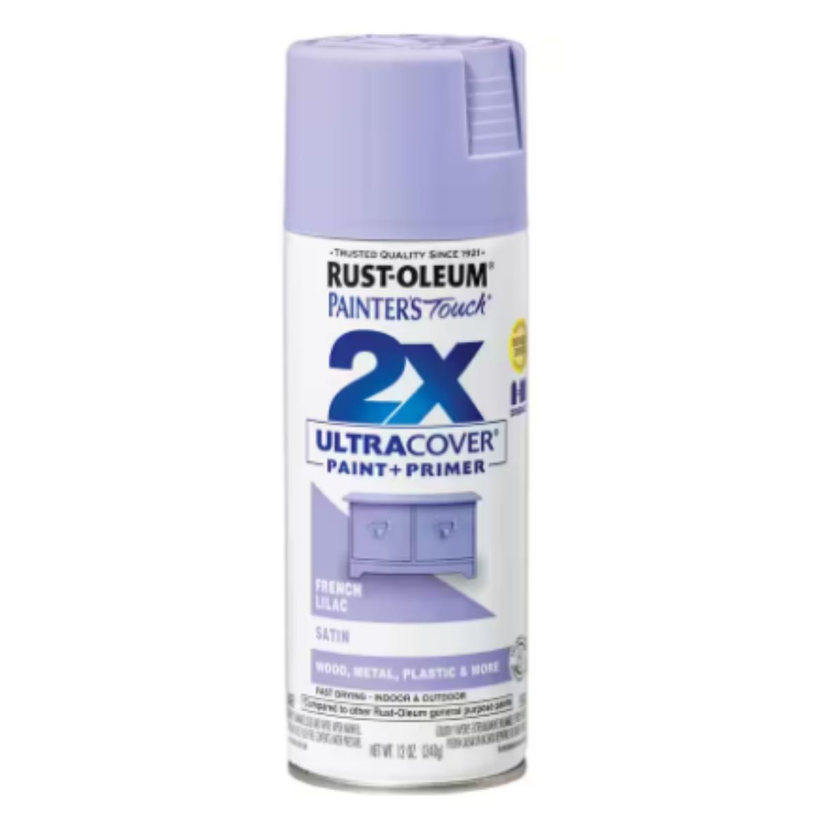 Rust-Oleum Painter's Touch Ultra Cover 2X 12 oz. Satin French Lilac General Purpose Spray Paint delivers exceptional coverage compared to other Rust-Oleum general purpose paints, thanks to its innovative double cover technology. This feature allows for quick project completion while ensuring superior hiding power and durability with its integrated paint and primer formula. Suitable for both interior and exterior applications on various surfaces like wood, metal, plastic, and more, this premium paint is designed to offer long-lasting protection. Each can covers up to 12 sq. ft. and provides a satin finish that imparts a fresh shine to surfaces. The comfort spray tip with a wider finger pad reduces finger fatigue during extended use and supports 360° spraying, including upside down for hard-to-reach areas. Its oil-based formula dries to the touch in just 20 minutes and contains double cover technology for efficient coverage. Cleanup is simple with mineral spirits. Ideal for achieving professional results in DIY projects or larger applications requiring reliable coverage and a satin finish.