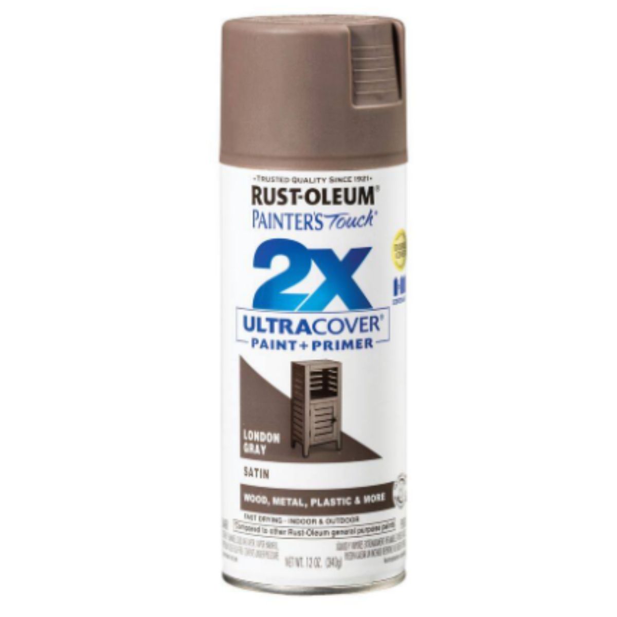 Rust-Oleum Painter's Touch Ultra Cover 2X 12 oz. Satin London Gray General Purpose Spray Paint is a versatile choice suitable for both interior and exterior use on various surfaces including wood, metal, and plastic. It features double cover technology that enhances coverage efficiency, allowing projects to be completed faster. The paint and primer formula ensures ultimate hiding power and durability, providing long-lasting protection. Its satin finish offers a smooth and fresh shine to surfaces, complemented by an any-angle spray system that facilitates spraying in any direction, including upside down for difficult-to-reach areas. The comfort spray tip with a wider finger pad reduces finger fatigue during extended use, while the oil-based formula dries to touch in just 20 minutes. Cleanup is convenient with mineral spirits. This product is ideal for achieving professional-quality results in both DIY projects and larger applications.