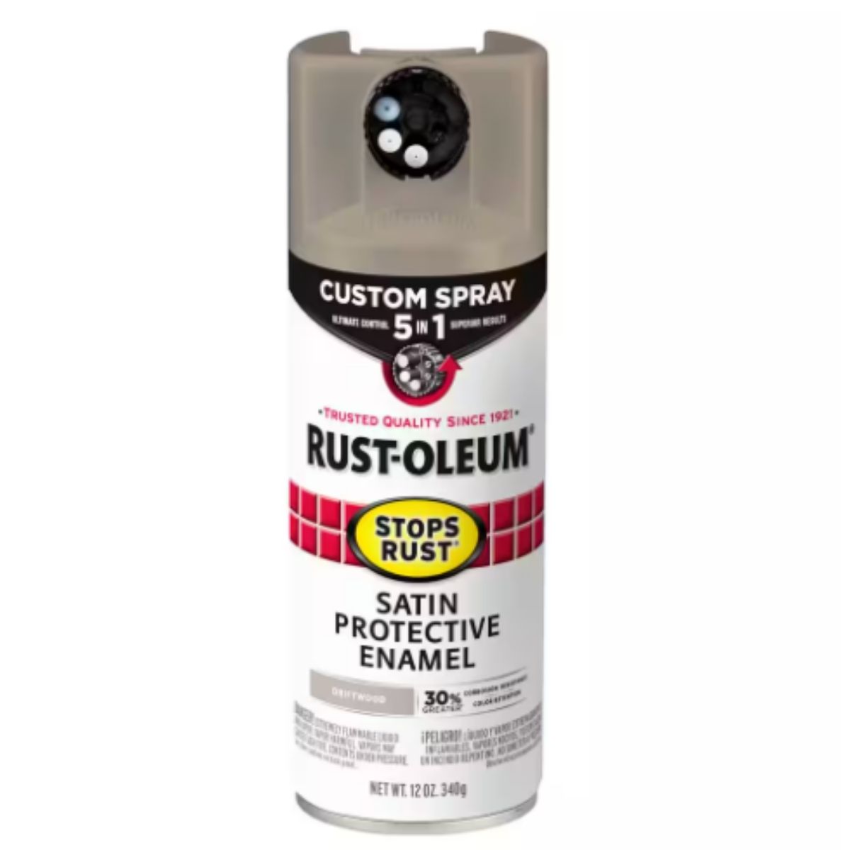 The Rust-Oleum Custom Spray 5-in-1 offers versatility with its selection of 5 custom spray paint nozzles, allowing precise control tailored to different project needs. Adjust the dial to choose from high output for large curved surfaces, standard for traditional applications, low output for detailed work, and vertical or horizontal fans for flat surfaces. After use, secure the dial in the locked position to preserve any remaining spray paint for future projects. Featuring Stops Rust Advanced Spray Paint technology, this product provides 30% greater corrosion resistance and improved color retention compared to standard options, ensuring durable protection against rust, abrasion, fading, chipping, and dulling. Suitable for indoor and outdoor use on metal and wood surfaces such as mailboxes and patio furniture, it delivers a fast-drying finish that enhances both toughness and attractiveness.