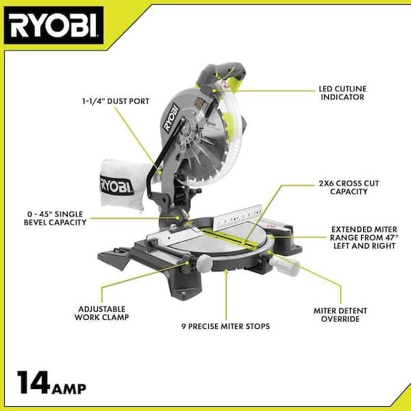 The RYOBI 10 in. Compound Miter Saw with LED is engineered for precision and power. Its robust 14 Amp motor reaches up to 5,500 RPM, effortlessly handling tough cuts. The saw includes a 1-1/4 in. dust port to maintain a clean workspace and a 24-tooth Carbide-Tipped blade for fast, clean performance. The integrated LED Cutline Indicator ensures accurate cuts every time.