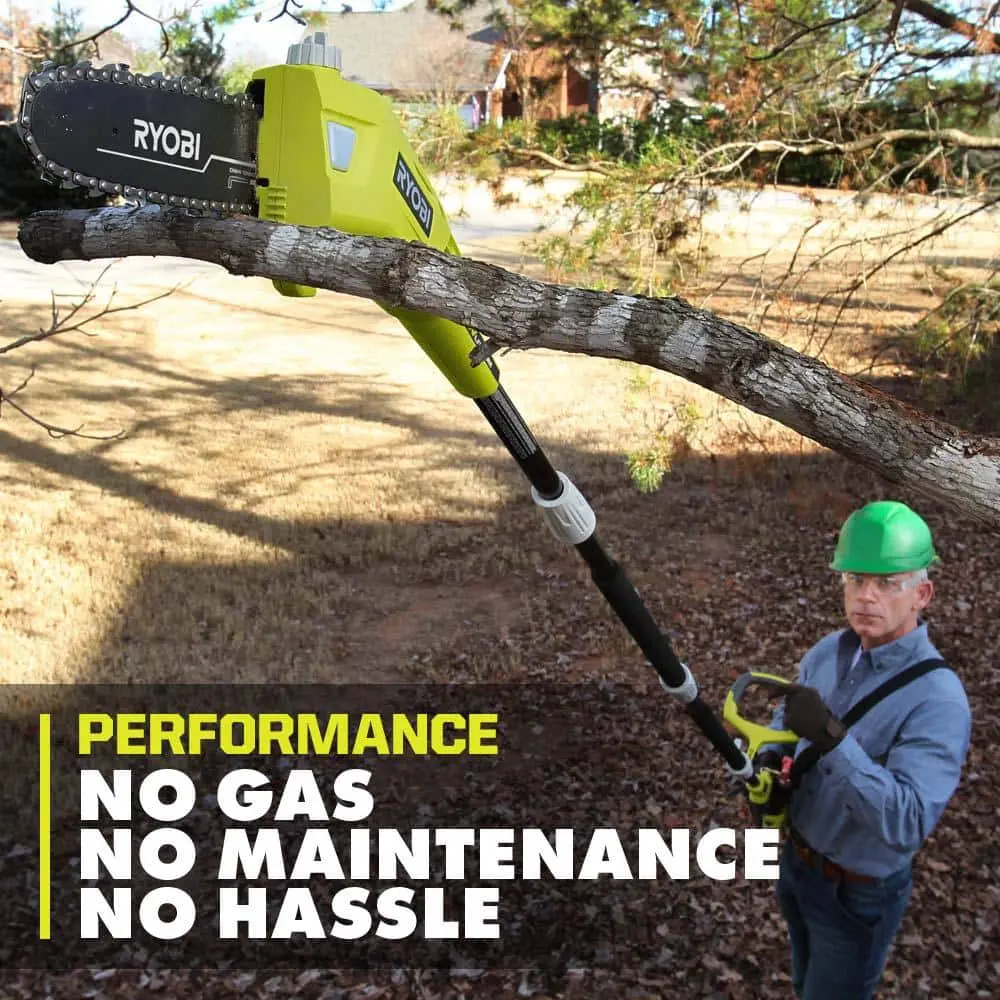 The RYOBI 40V Pole Saw is perfect for all your pruning and limbing tasks. With an adjustable length from 6.5 ft. to 9.5 ft., it easily reaches difficult areas. Its powerful in-line motor and angled cutting head ensure precise cuts with the 10 in. bar and chain. The pole saw also features an automatic bar and chain oiler for easy operation and maintenance. Designed for compatibility with all RYOBI 40V batteries, this tool offers versatility for any 40V system user. Battery and charger sold separately.