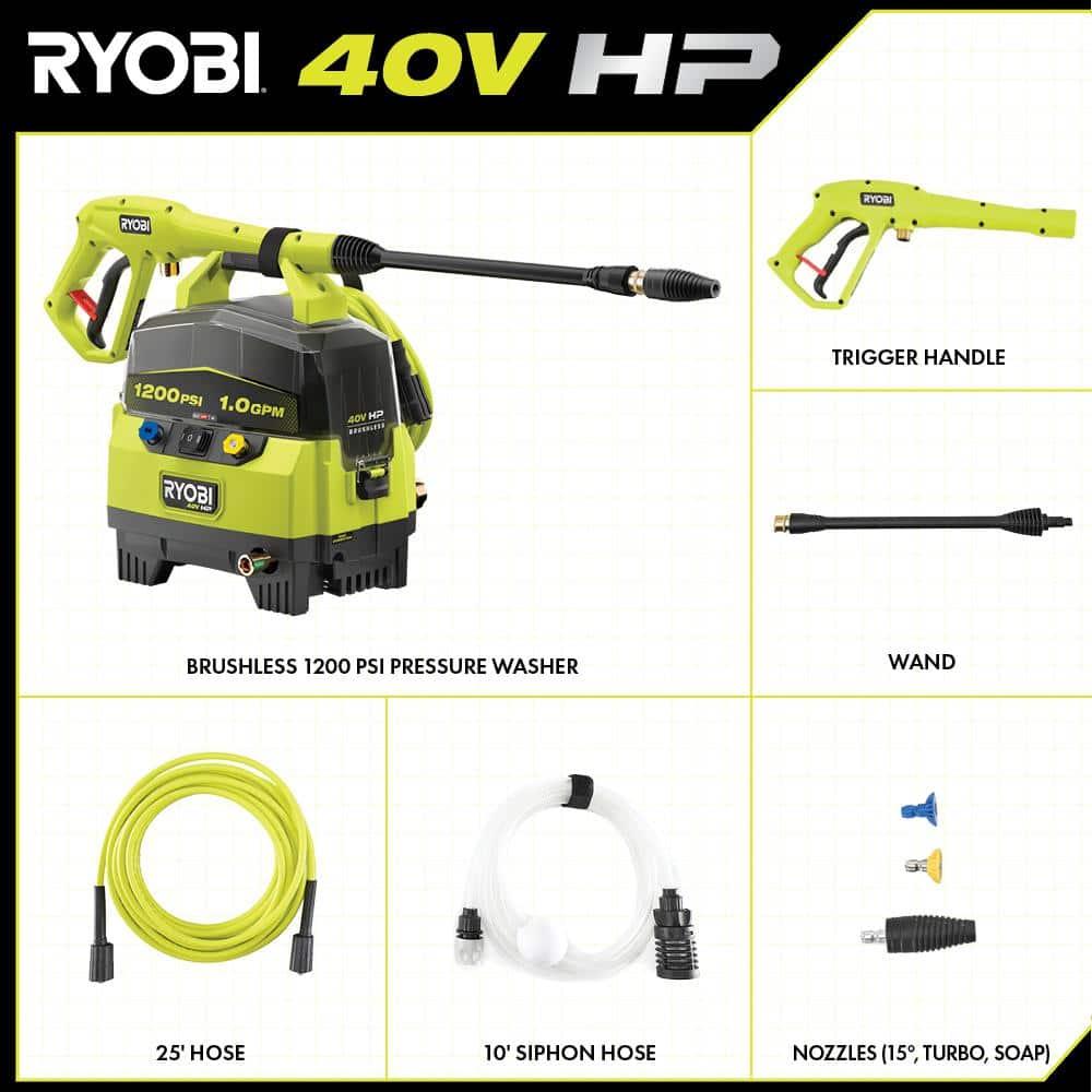 The RYOBI 40V HP Brushless Pressure Washer provides portable cleaning without cords. With 1200 PSI and 1.0 GPM, it handles a range of tasks from washing cars to cleaning docks. It can be used with a standard garden hose or the included siphon hose for drawing water from any fresh water source. The unit offers up to 40 minutes of runtime with a 40V 12Ah battery and features two modes: ECO Mode at 900 PSI and 0.8 GPM for longer runtime, or HIGH Mode at 1200 PSI and 1.0 GPM for maximum performance. Its lightweight design ensures easy transport around your property.