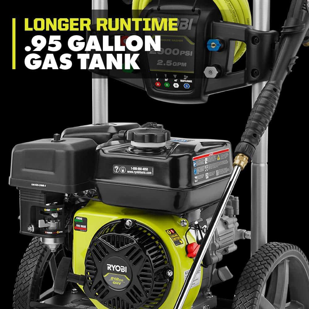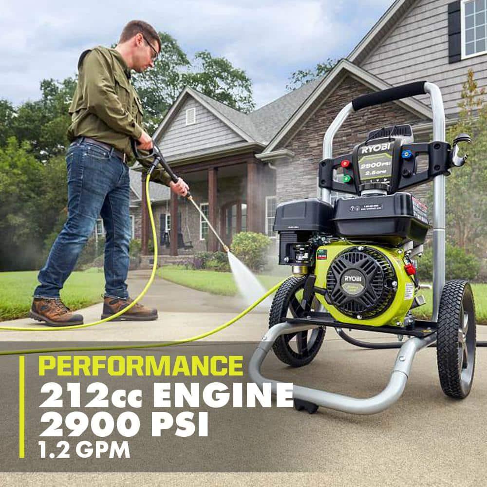The RYOBI 2900 PSI 2.5 GPM Gas Pressure Washer is engineered for heavy-duty cleaning tasks. Its powerful 212 cc horizontal engine excels at removing tough dirt from siding, bricks, sidewalks, and driveways. It includes four nozzles (0, 25, 40, & Soap) for versatile cleaning, and the sturdy metal wand with a quick-connect coupler simplifies nozzle changes. Designed for easy transport, it features a durable hand truck frame and large 12-inch flat-free wheels. The large fuel tank ensures extended runtime, minimizing the need for frequent refueling. A siphon hose allows for efficient detergent application, and the on-board storage keeps nozzles organized when not in use.