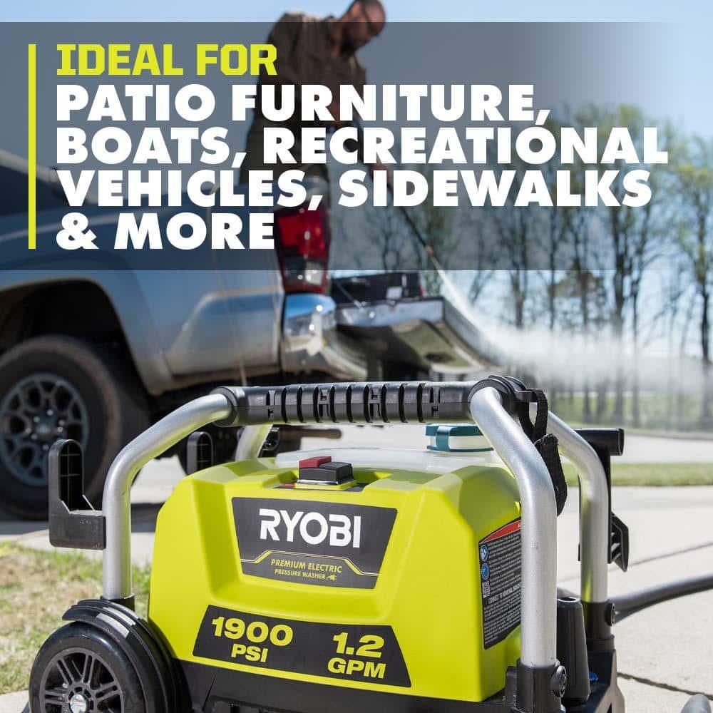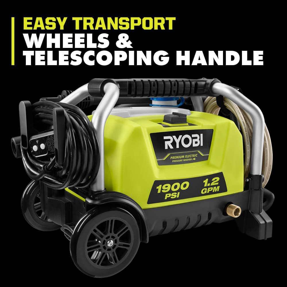 The RYOBI 1900 psi Electric Pressure Washer offers a seamless blend of portability, lightweight design, and long-lasting durability. Its frame is equipped with wheels and a telescoping handle, ensuring effortless transportation. This makes it an ideal option for various applications, including cleaning patios, decks, boats, campers, and other recreational vehicles.