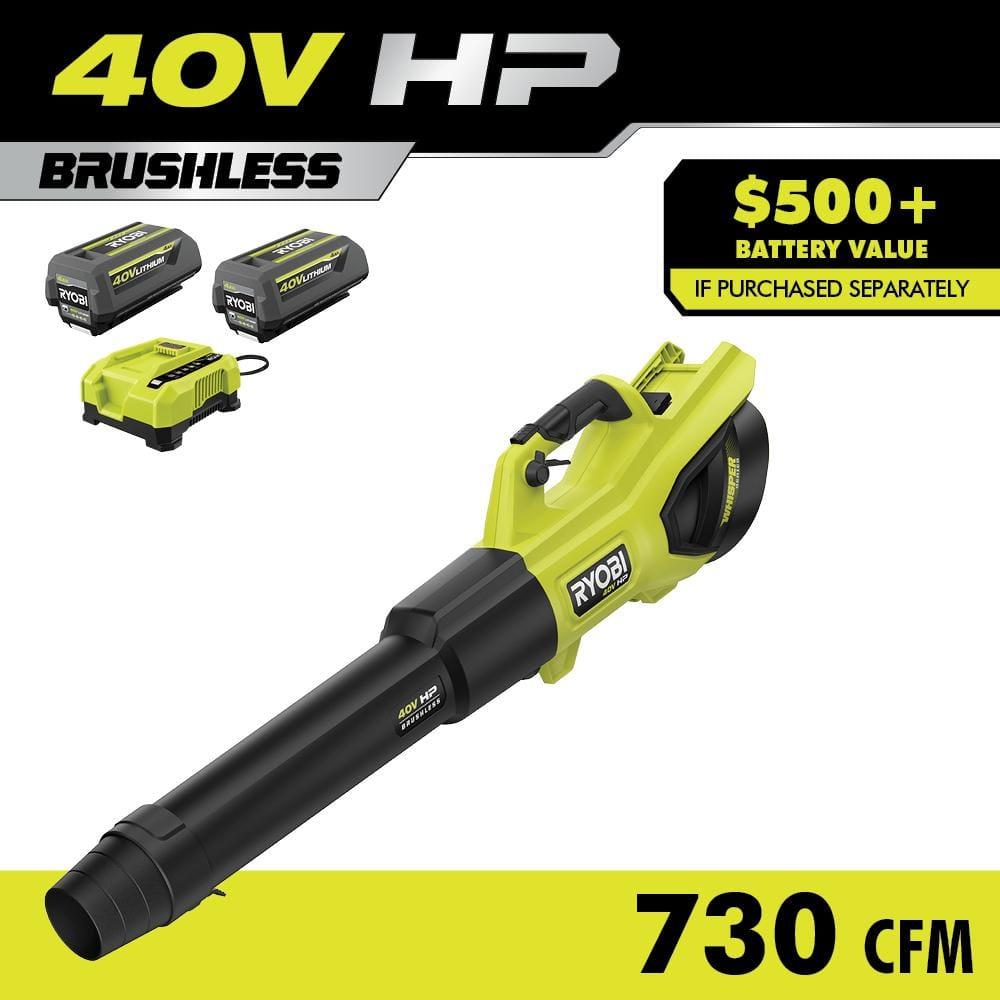 RYOBI 40V HP Cordless Jet Fan Blower brings exceptional power and efficiency to your outdoor cleanup. Powered by 40V HP technology, this blower outperforms a 27cc gas blower without the hassle of gas or maintenance. Delivering an impressive 730 CFM and 190 MPH, it effortlessly handles heavy lawn debris and wet leaves. The blower is equipped with 40V HP technology that combines a brushless motor, advanced electronics, and lithium technology, providing up to 120 minutes of runtime with the included (2) 40V 4Ah batteries. Its Whisper Series design features noise-dampening foam and a uniquely positioned fan, making it 86% quieter than gas and other cordless blowers. Control airflow with precision using the variable speed trigger and turbo button. The blower also includes two customizable speed tips for enhanced blowing power. Part of the RYOBI 40V System, it is compatible with any 40V battery in the lineup. This kit includes the RY404010 40V Jet Fan Blower, (2) OP40404 40V 4Ah Lithium Batteries, OP406 40V Rapid Charger, Blower Tube, (2) Speed Tips, and Operators Manuals.