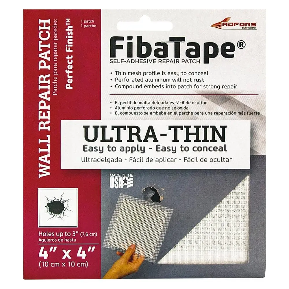 Saint-Gobain ADFORS FibaTape Perfect Finish 4 in. x 4 in. Self-Adhesive Wall Repair Patch is self-adhesive, eliminating the need for additional adhesives and sticking directly to the wall for hassle-free application. It offers quick and easy application, simplifying your wall repairs with minimal effort. The patch is durable, ensuring long-lasting repairs on both walls and ceilings. Designed to provide a perfect finish, it helps create a smooth, seamless surface that’s ready for painting. Its compact size of 4 in. x 4 in. makes it ideal for repairing small holes and cracks