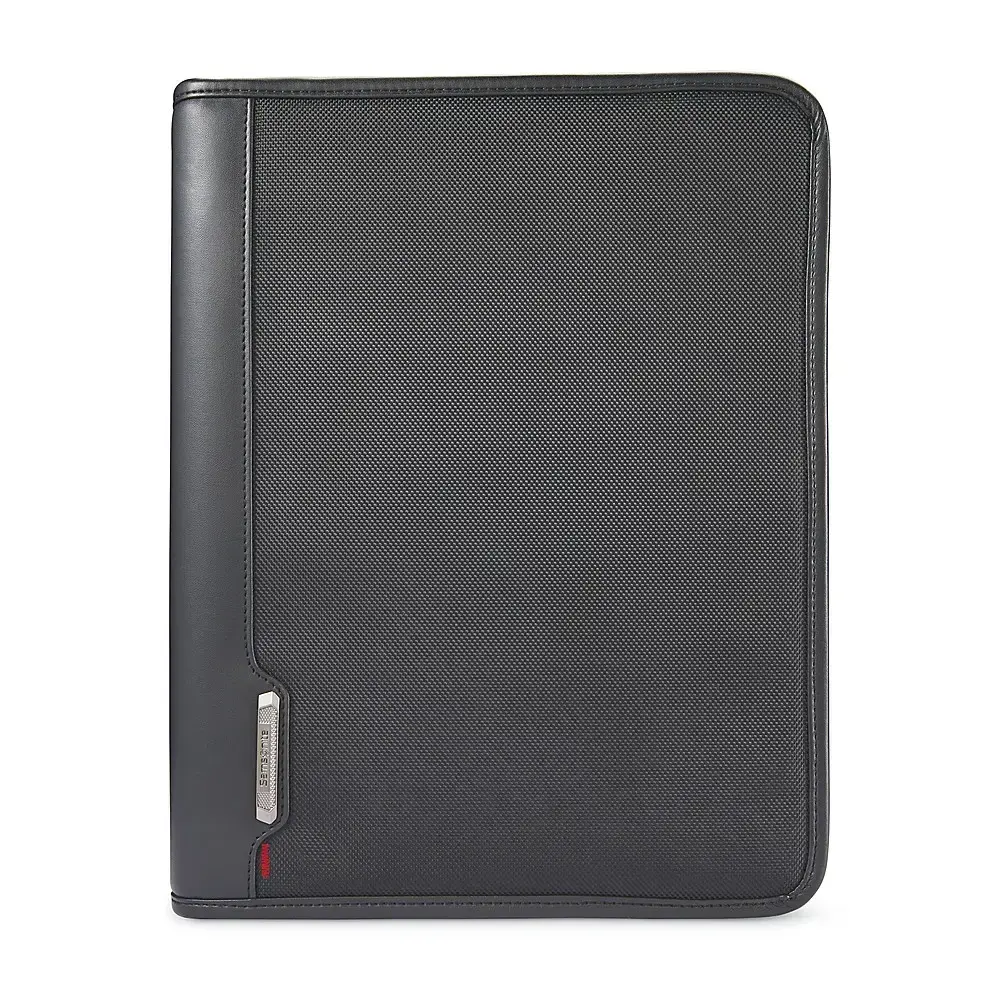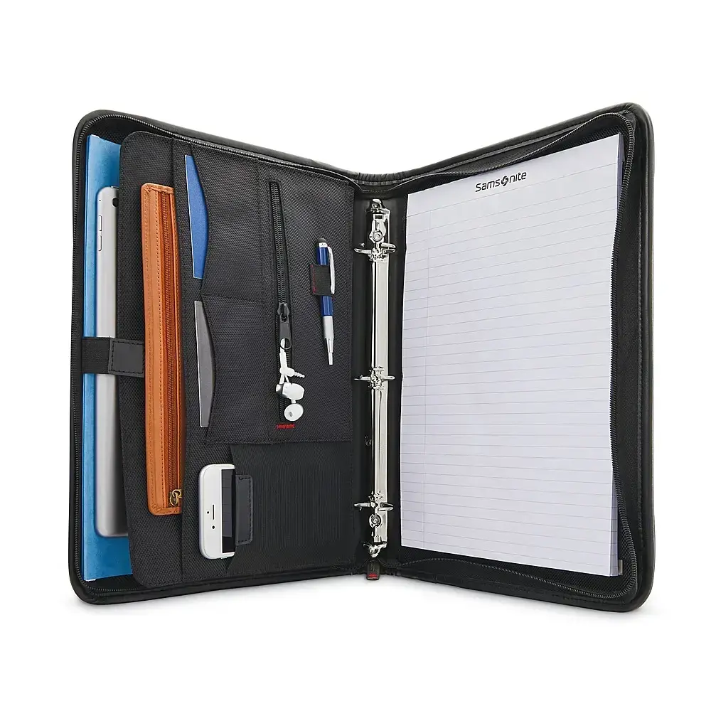 Stay organized with this sleek and compact Samsonite leather padfolio, designed to keep your business essentials in place. It features dedicated spaces for folders, business cards, your phone, and tablet. The padfolio also includes a writing pad and a pen loop holder, along with a 1" three-ring binder and a secure inner zipper pocket. Crafted from durable ballistic fabric with vinyl trim, this classic black padfolio is accented with a matte gunmetal textured logo.