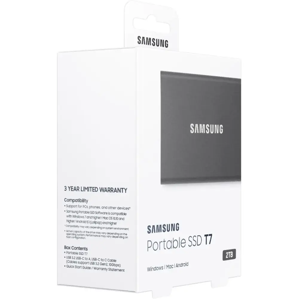 The Samsung Geek Squad Certified Refurbished T7 2TB External USB 3.2 Gen 2 Portable SSD offers 2TB of spacious storage for all your files, providing fast and efficient data transfer speeds of up to 1,050MB/s thanks to its USB 3.2 Gen 2 connectivity. With hardware encryption, your data remains secure while on the go, ensuring privacy and protection. Its compact and durable design makes it easy to carry anywhere, while the Titan Gray color gives it a sleek, professional appearance. This Geek Squad certified SSD ensures you receive a reliable and high-performance product, perfect for both everyday use and secure data storage