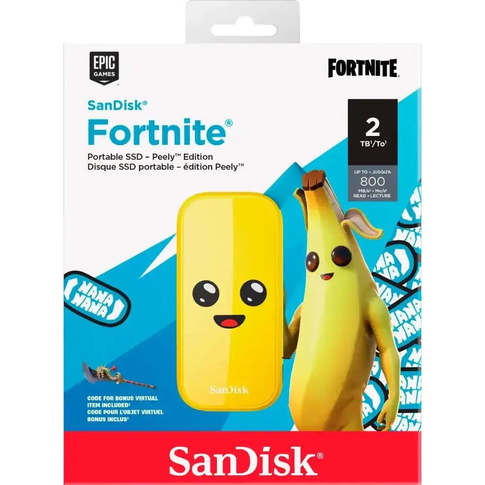 Jump off the Battle Bus and into action with the limited-edition SanDisk Fortnite Portable SSD, Peely edition. Store your top game clips and progress on this player-tested drive, offering up to 2TB of capacity and read speeds of 800MB/s. Plus, get an exclusive in-game pickaxe to add to your arsenal for free. Designed with a custom Peely skin and built to withstand the toughest conditions, this drive is perfect for Fortnite fans. It's compatible with Windows 10+, macOS 10.13+, PlayStation 4 & 5, and Xbox Series X|S.