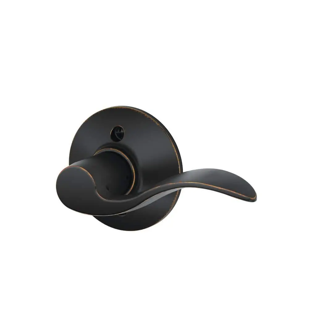 The Schlage Accent Aged Bronze Dummy Door Lever is a non-turning lever, commonly used as a decorative pull for doors that don't require latching. Its elegant, wave-like design effortlessly complements a room's style without overpowering it. The aged bronze finish, with warm copper tones peeking through a darker exterior, is inspired by traditional design. This lever is designed and tested for strength and durability.