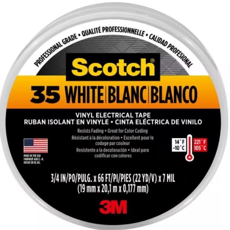 The Scotch 0.75 in. x 66 ft. x 7 mil #35 Electrical Tape, White is designed for reliable electrical insulation and protection. Size: 0.75 inches wide, 66 feet long, and 7 mil (0.007 inches) thick. Color: White. Material: Made from durable vinyl for flexibility and abrasion resistance. Adhesive: Features a strong, rubber-based adhesive that provides excellent adhesion to various surfaces. Temperature Rating: Suitable for use in a wide range of temperatures. Applications: Ideal for insulating electrical wires, bundling cables, and marking. It is also useful for color-coding and protecting electrical connections. Features: Offers good conformability to surfaces, is resistant to moisture and chemicals, and provides long-lasting performance. This electrical tape is widely used in both residential and commercial settings for various electrical and maintenance tasks.