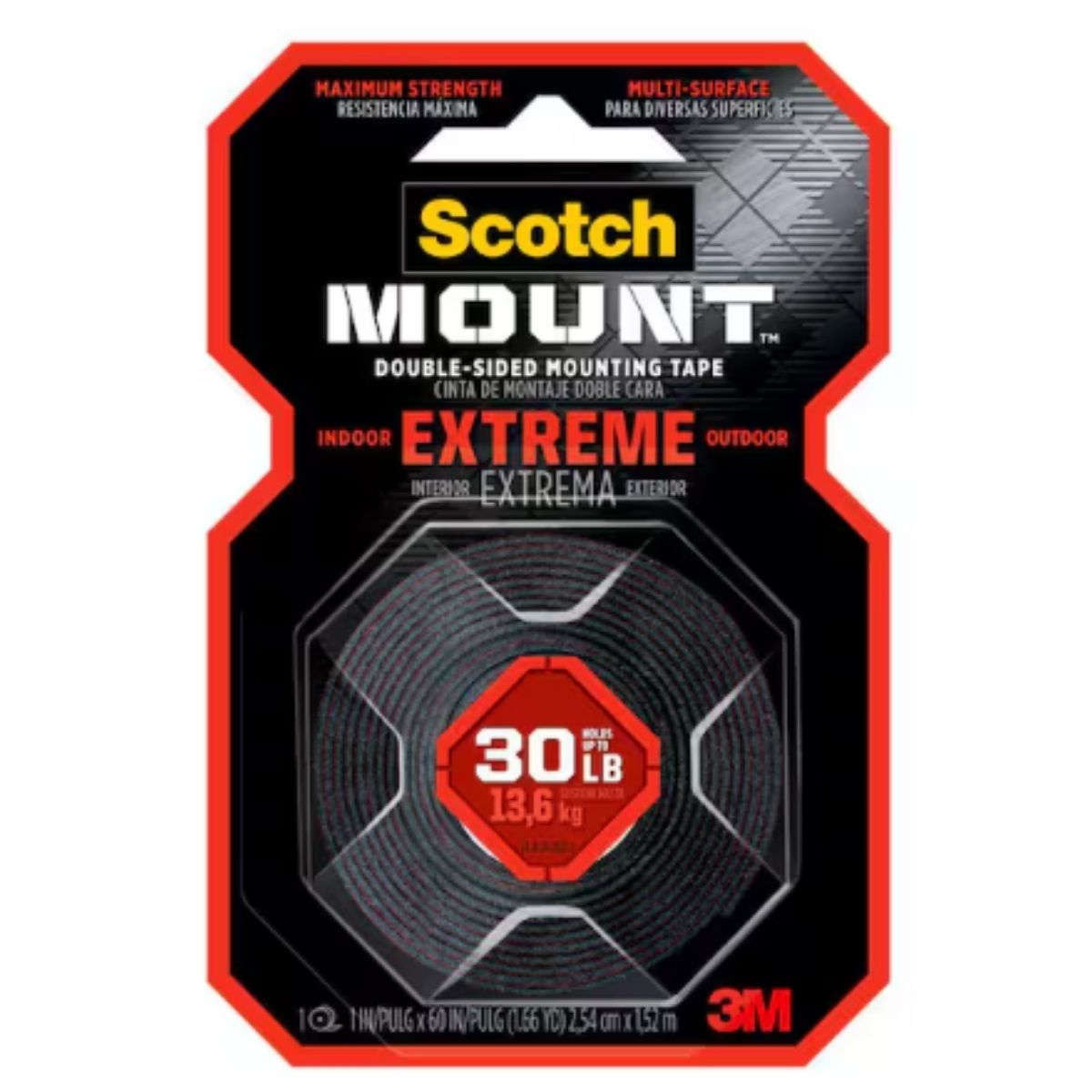 Scotch-Mount Extreme Double-Sided Mounting Tape is engineered for the toughest jobs, offering maximum strength with its 3M industrial strength adhesive. This tape provides a superior, conformable bond on contact, capable of holding items weighing up to 30 pounds. Designed for both indoor and outdoor use, it boasts weather resistance for a durable bond in various conditions. Whether you're mounting artwork indoors or adding organization to your garage outdoors, this tape ensures a secure hold without the need for tools. It is suitable for surfaces such as painted drywall, painted/finished wood, metal, acrylic, smooth stone, and painted concrete. The tape can be applied in temperatures ranging from 50°F to 100°F, making it versatile for different climates. Its easy-to-apply design simplifies DIY projects, and it eliminates the mess associated with nails and screws. For optimal adhesion, ensure the surface is smooth, clean, and dry before application. Made in the USA with globally sourced materials, this product comes in a 1 inch x 60 inch roll, in black color, ideal for discreet mounting solutions both indoors and outdoors.