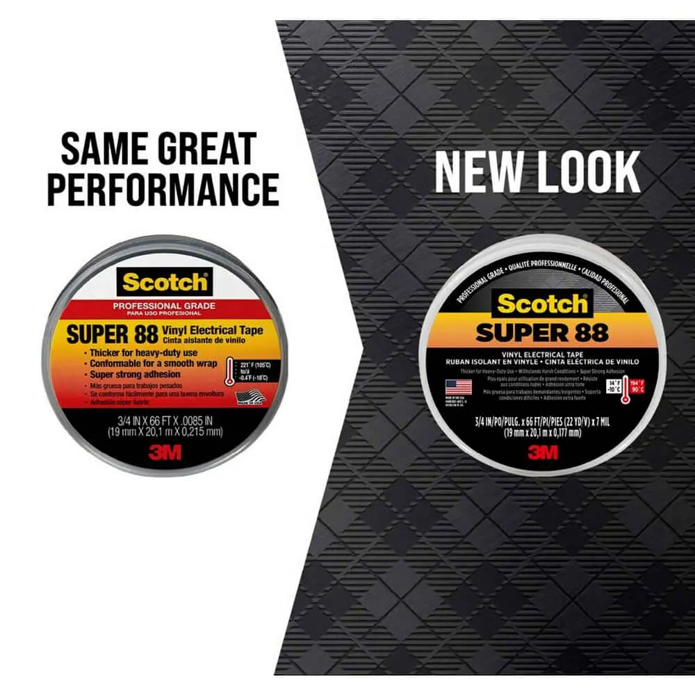 Scotch Vinyl Electrical Tape Super 88 offers exceptional protection and insulation for electrical wires, cables, and components in demanding applications. The rubber-based adhesive with an elastic backing provides moisture-tight electrical and mechanical protection with minimal bulk. Its superior durability and versatility make it ideal for heavy-duty projects.