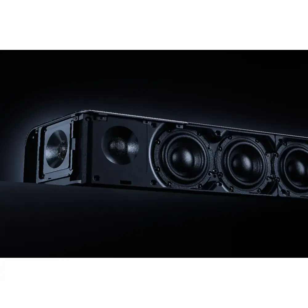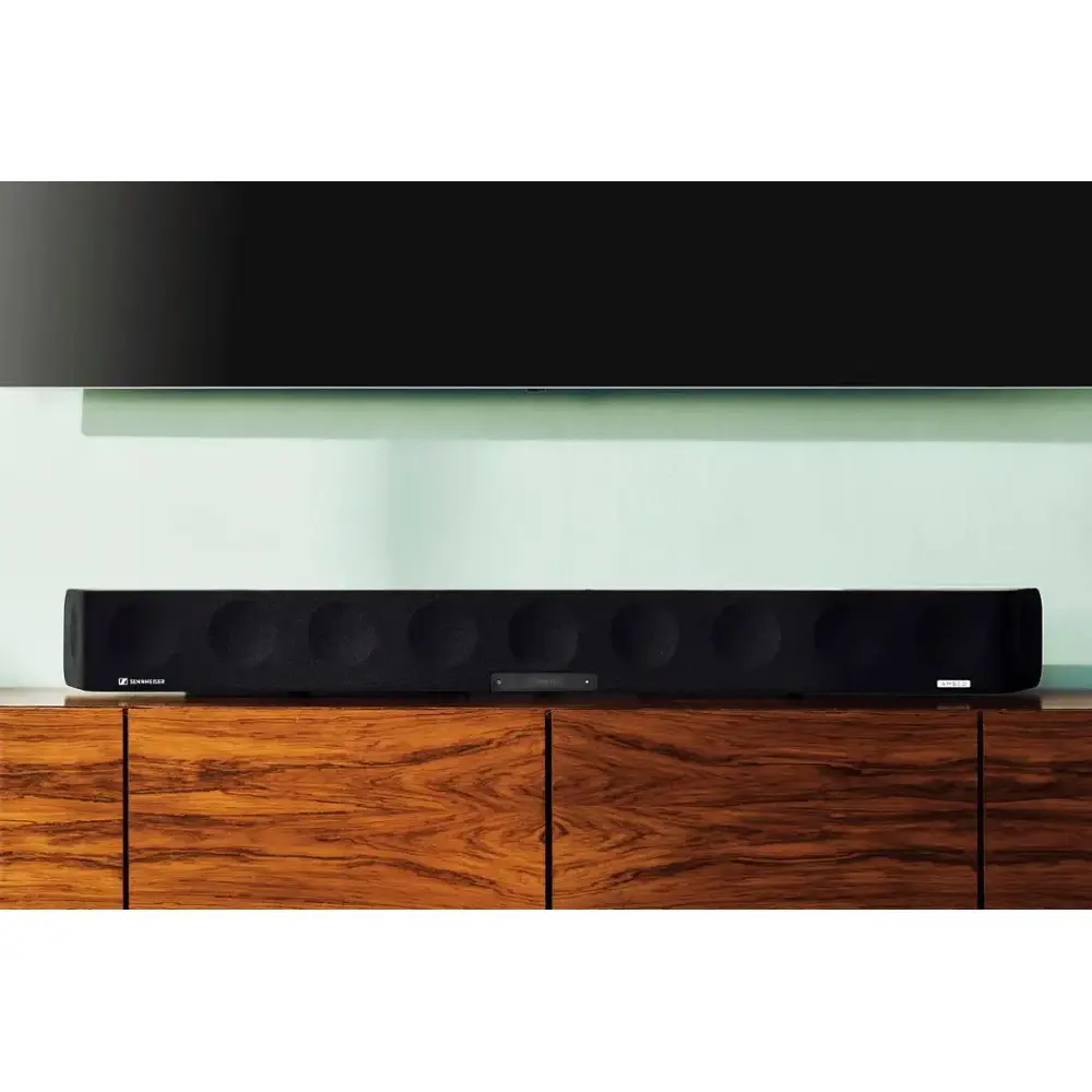 The Sennheiser AMBEO Soundbar offers an exceptional audio experience with its 5.1.4 channel sound, delivering immersive, multidimensional audio for a cinematic feel. With Dolby Atmos & DTS:X, it creates stunning depth and clarity, making every movie or song feel more lifelike. The built-in, powerful integrated subwoofer provides rich, deep bass without needing a separate subwoofer. Featuring 3D audio technology, it ensures realistic sound placement for a fully immersive surround sound experience. Additionally, the soundbar offers customizable sound profiles, allowing you to tailor the audio to your room and personal preferences. With Wi-Fi, Bluetooth, and HDMI connectivity, it ensures effortless integration with all your devices, all while boasting a sleek, black design that fits seamlessly into any home décor