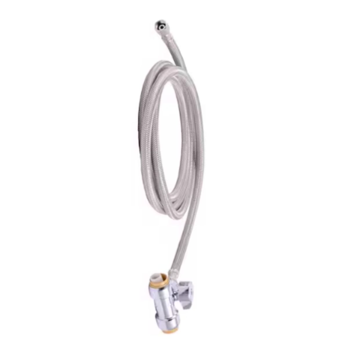 SharkBite ice maker connector with tee stop valve: easy installation or repair for ice maker water supply. Pre-connected 10 ft. stainless steel hose to push-to-connect tee stop valve. Compatible with copper, PEX, CPVC, or PE-RT. No soldering or special tools needed. Stainless steel teeth grip tight, O-ring ensures perfect seal. Fast disassembly with disconnect tool for reuse, even in tight spaces.Works on any combination of Copper, CPVC, PE-RT, and PEX PipeProvides everything you need to install an Ice MakerSupply line is integrated to the stop valve for a leak free joint
