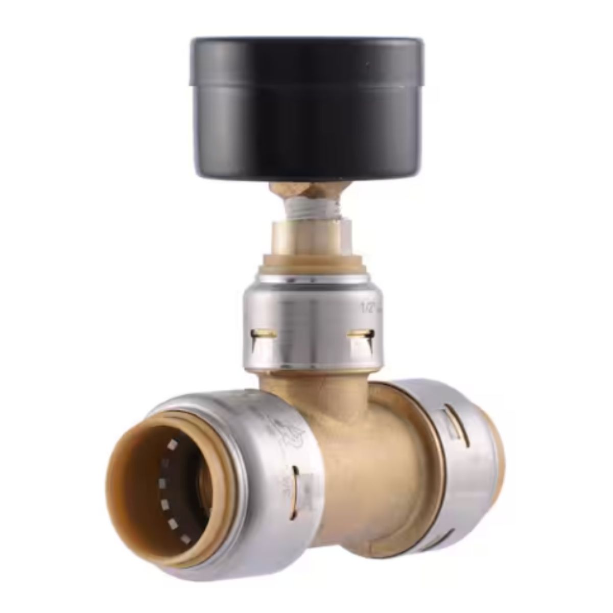 The SharkBite Max push-to-connect tee with water gauge is the quickest and simplest way to connect PEX, copper, CPVC, or PE-RT pipes. It requires half the effort for insertion and withstands double the burst pressure. Featuring a stainless-steel retainer for durability and a 250-psi pressure rating, it doesn't need a PEX tube liner and requires no soldering or special tools. Rotation for adjustments and swift removal with a disconnect tool make it convenient for reuse or replacement of fittings and valves.Fastest way to connect PEX, copper, CPVC, or PE-RT pipeHalf the insertion force with double the burst pressureCan be installed on wet lines and pressure tested immediately