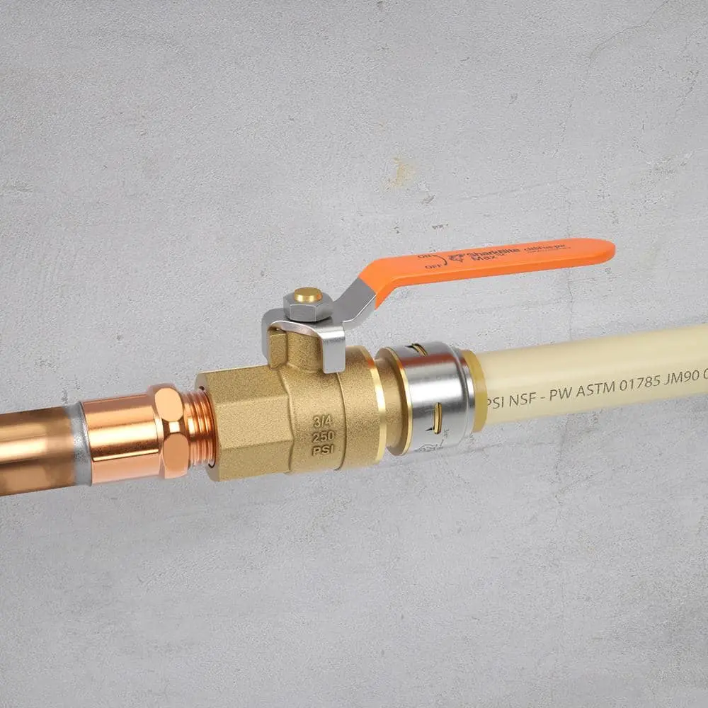 SharkBite Max push-to-connect ball valves offer the quickest and simplest way to install a water shut-off valve, whether for new installations or replacements. The upgraded stainless steel collet retainer enhances strength and durability, providing a 250 psi pressure rating. These fittings and valves don't require a PEX tube liner, and their redesigned body allows for easier, low-force pipe insertion. The quarter-turn lever handle enables swift water flow control, even in tight spaces. No soldering, clamps, unions, glue, or special tools are needed. Once the pipe is inserted, stainless steel teeth securely grip it, while a specially formulated O-ring forms a watertight seal. The valve is rotatable after installation for easier adjustments, and removal is just as simple with a disconnect tool, allowing the valve to be reused or replaced.