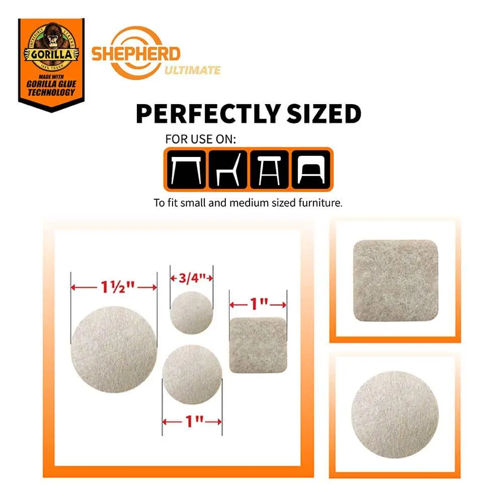 The Shepherd Ultimate Beige Assorted Felt Pads with Gorilla Glue Technology, available in a 134-piece pack, offers exceptional protection for both furniture and floors. Designed with advanced Gorilla Glue Technology, these pads provide a strong, long-lasting bond, keeping them securely in place to prevent scratches and damage. The assortment of sizes makes them ideal for chairs, tables, and other furniture. The neutral beige color blends effortlessly with various décor styles, maintaining your home’s aesthetic. With a convenient self-adhesive backing, installation is quick and easy.