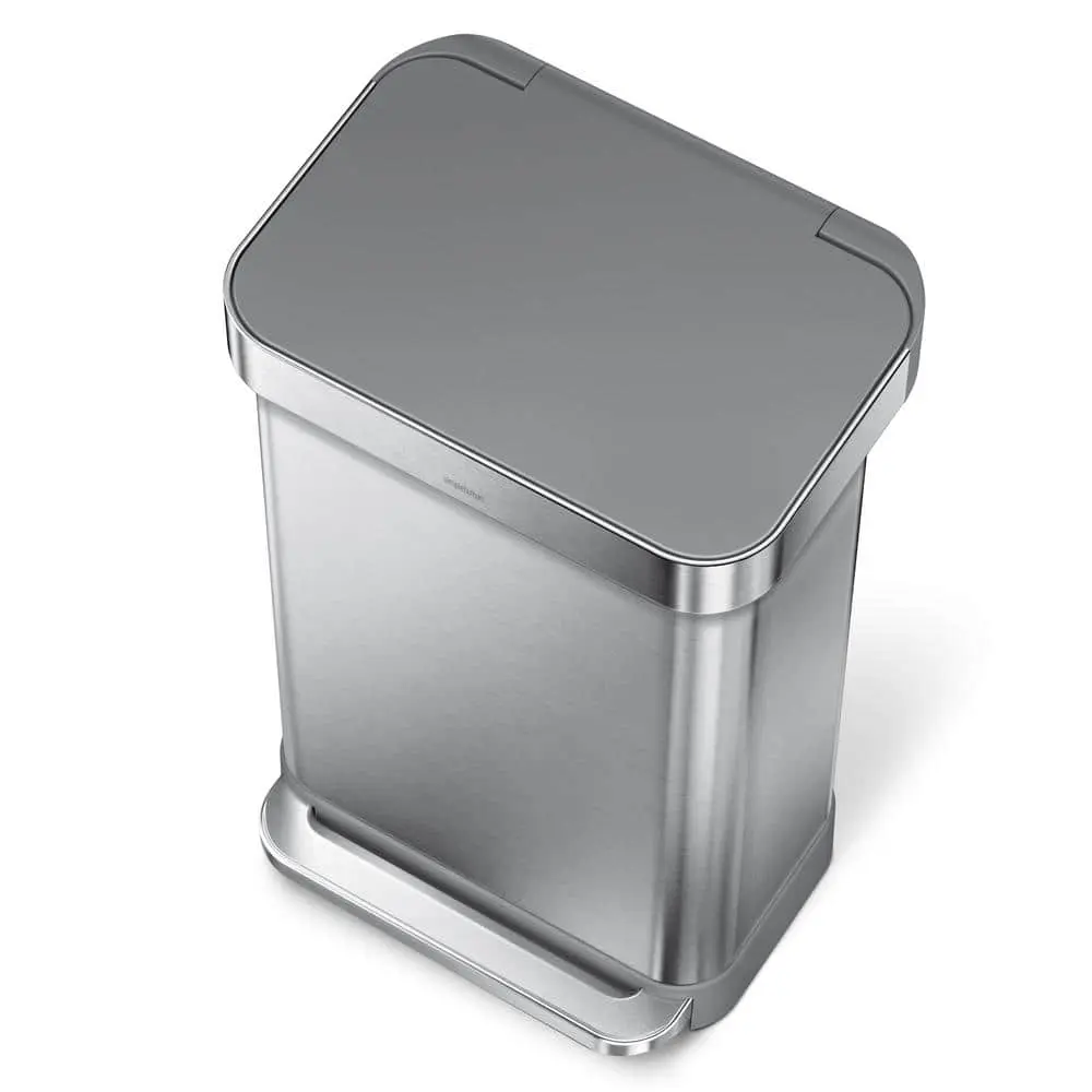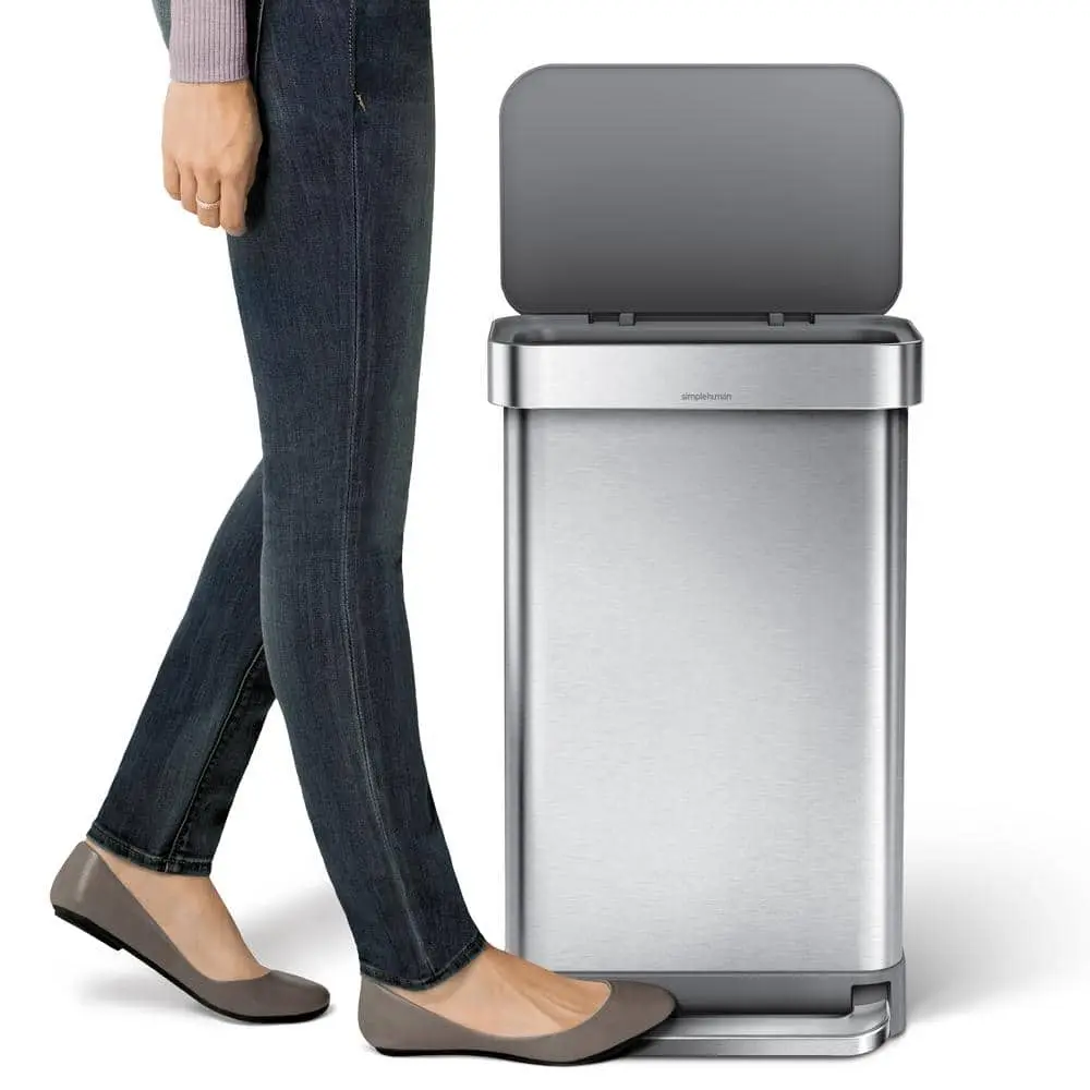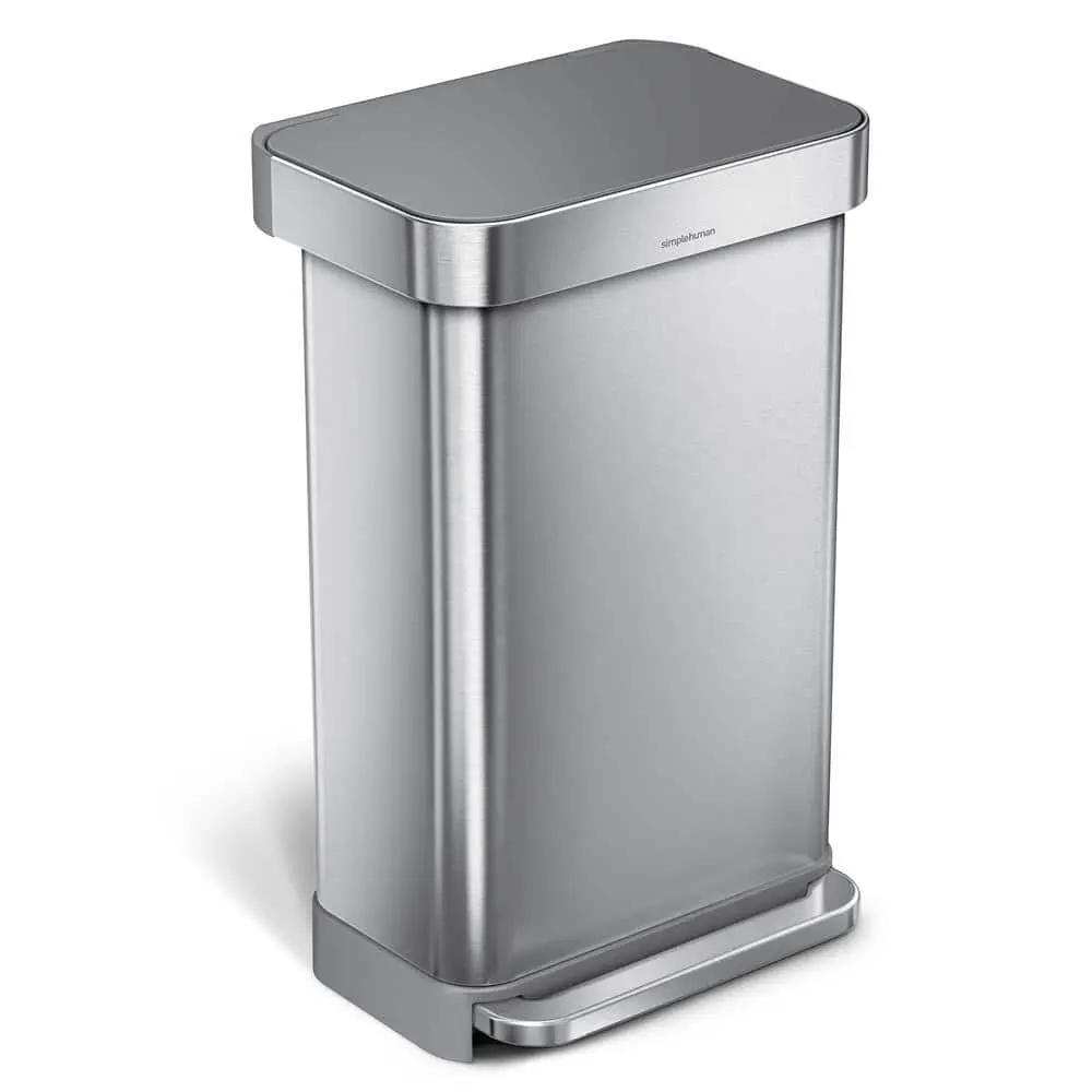 The simplehuman stainless steel rectangular step can features an innovative 'liner pocket' that stores and dispenses liners from inside the can, making liner changes quicker and easier. The stainless steel liner rim securely grips the liner, keeping it concealed. With no inner bucket, the design offers more space for trash. The durable plastic pedal is built to last, while the patented Lid Shox technology ensures a smooth, silent close of the dent-proof plastic lid. Code M liner refill packs fit perfectly in the liner pocket for easy storage. Additionally, the can includes an all-natural Odorsorb pod that discreetly fits under the lid to neutralize odors for up to 45 days.
