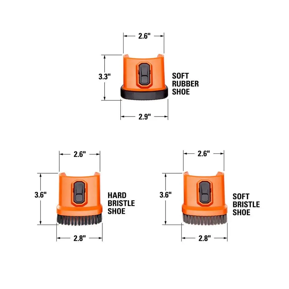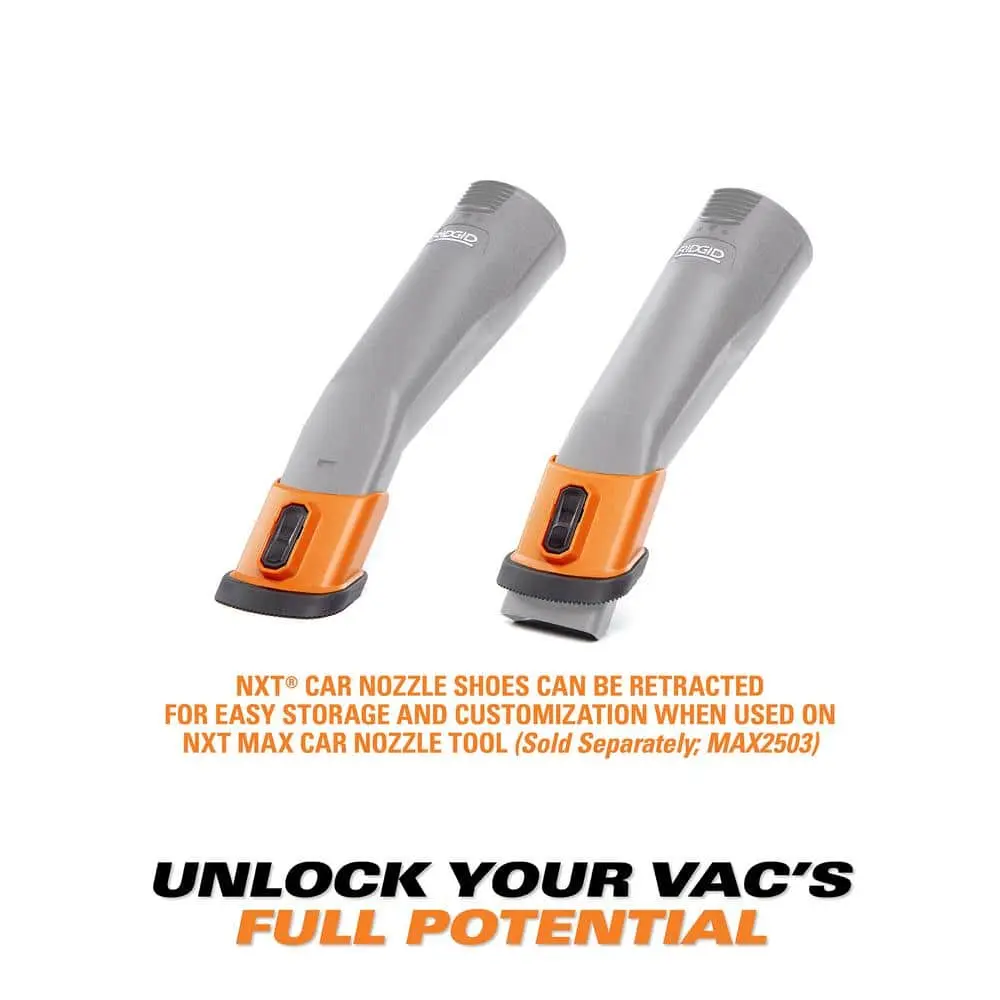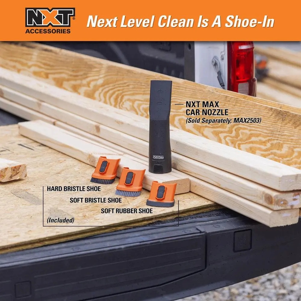 Upgrade your cleaning experience with the RIDGID NXT Max Car Nozzle Bristle Shoe Kit, designed for use with the NXT Max Car Nozzle (MAX2503; sold separately) and compatible with RIDGID 2-1/2 in. wet/dry vacuum accessories. This kit includes three interchangeable shoes—Hard Bristle, Soft Bristle, and Soft Rubber—allowing you to customize your cleaning approach.