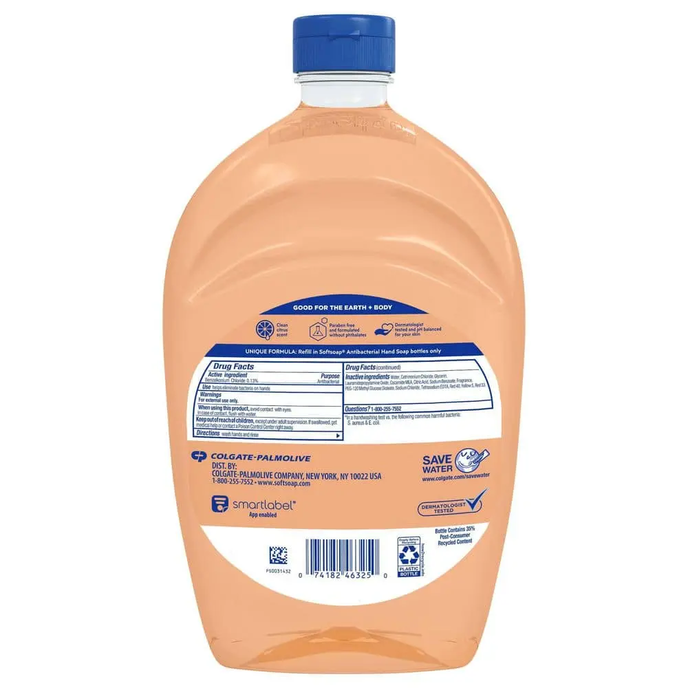 Softsoap Crisp Clean Antibacterial Liquid Hand Soap, the #1 liquid hand soap brand, eliminates 99.9% of bacteria* while leaving hands feeling clean and fresh with a refreshing citrus scent. Enriched with moisturizers, it helps protect your skin's natural barrier and retain moisture. The 50oz refill bottle can refill over six 7.5oz bottles and is paraben-free, phthalate-free, and dermatologist-tested. Its unique formula should only be used with Softsoap Antibacterial Liquid Hand Soap. With every use, enjoy a moment of joy and cleanliness, making your daily routines a little more fun and uplifting!