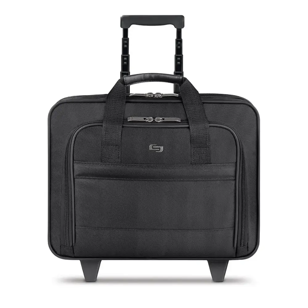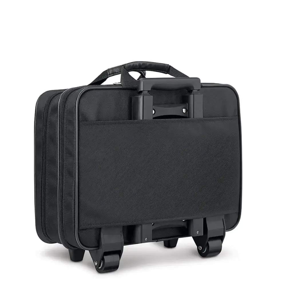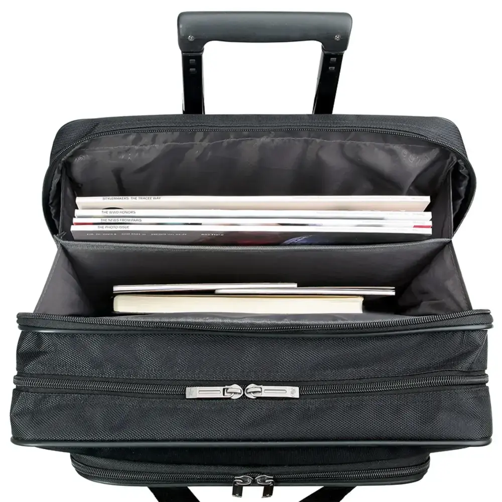 The case features a padded compartment that protects laptops up to 15.6" in size. It includes a full-size front zip-down organizer for easy storage and a divided file compartment to keep documents neatly separated. For convenience, the case is equipped with padded carry handles and a telescoping handle system, making it easy to transport. Its lightweight design and easy glide wheels ensure smooth and effortless movement.